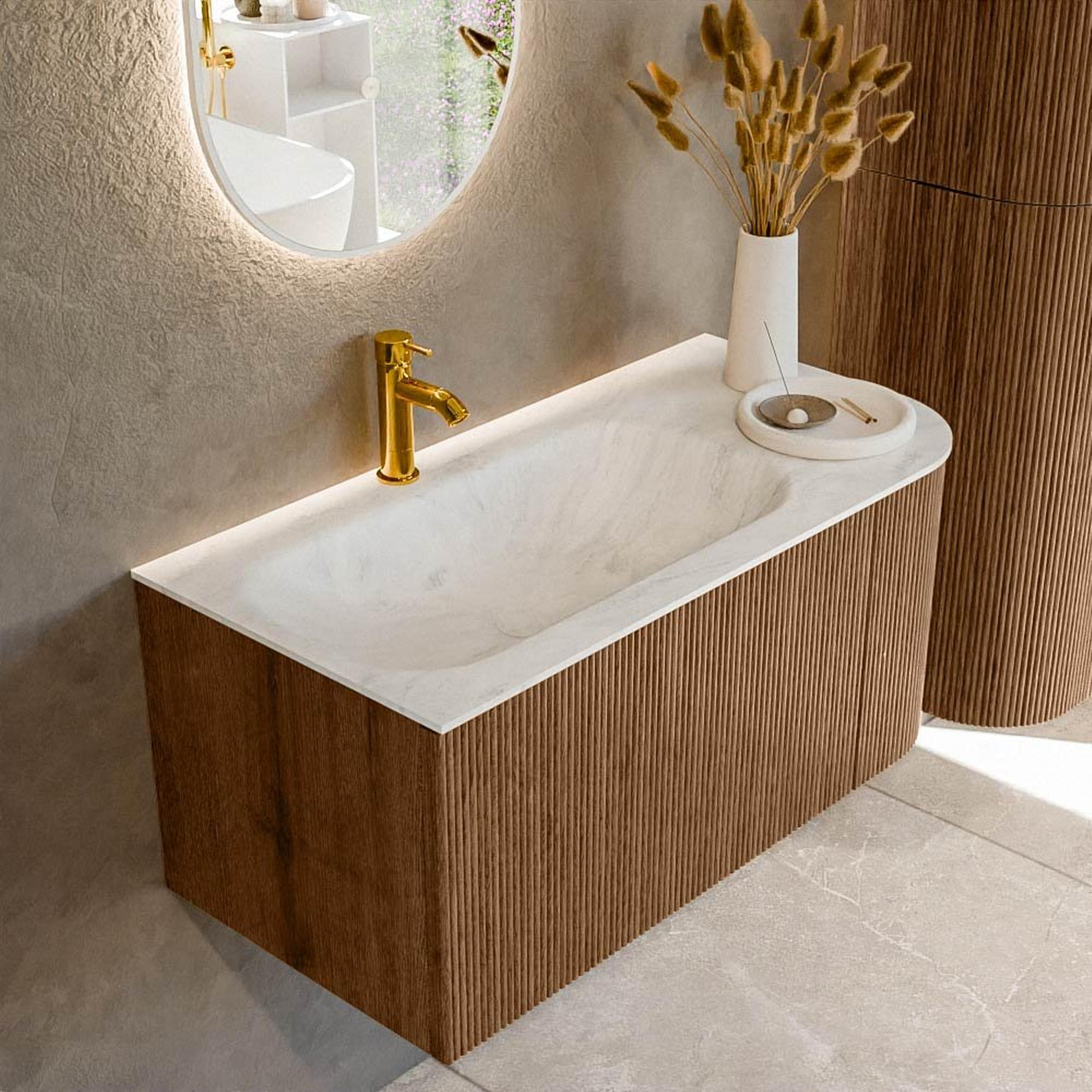 Het ultieme badmeubel dat je badkamer transformeert tot een oase van verfijning. Met zijn halfronde, verticale stroken van massief eiken, verkrijgbaar in de kleuren Oak en Walnut, straalt KURVE vakmanschap uit in elk detail. De zachte rondingen en slim ontworpen deurtjes, elk 40cm hoog, nodigen uit tot gebruik, terwijl de ruimte binnenin optimaal benut wordt dankzij de royale lade van dezelfde hoogte.