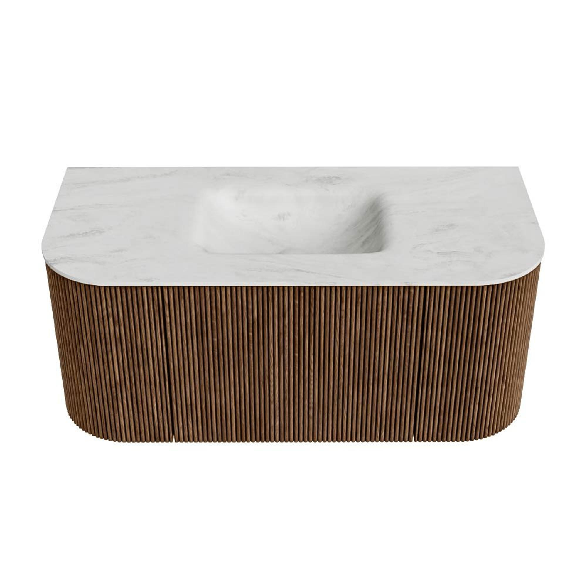 MONDIAZ KURVE-DLUX 100cm badmeubel met module 25 Len R kleur Walnut met 1 lade en 2 deuren. Wastafel GRUNNE midden 1 kraangat kleur Opalo.
