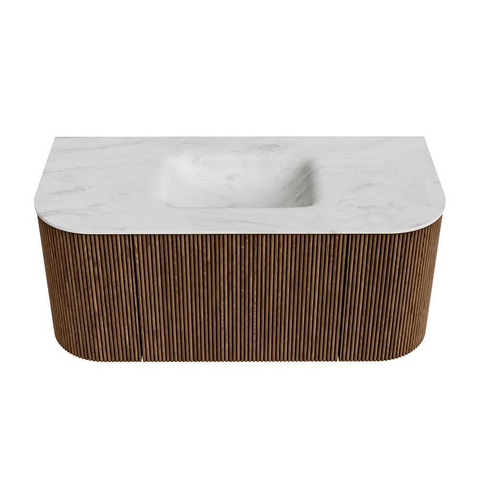Het ultieme badmeubel dat je badkamer transformeert tot een oase van verfijning. Met zijn halfronde, verticale stroken van massief eiken, verkrijgbaar in de kleuren Oak en Walnut, straalt KURVE vakmanschap uit in elk detail. De zachte rondingen en slim ontworpen deurtjes, elk 40cm hoog, nodigen uit tot gebruik, terwijl de ruimte binnenin optimaal benut wordt dankzij de royale lade van dezelfde hoogte.
