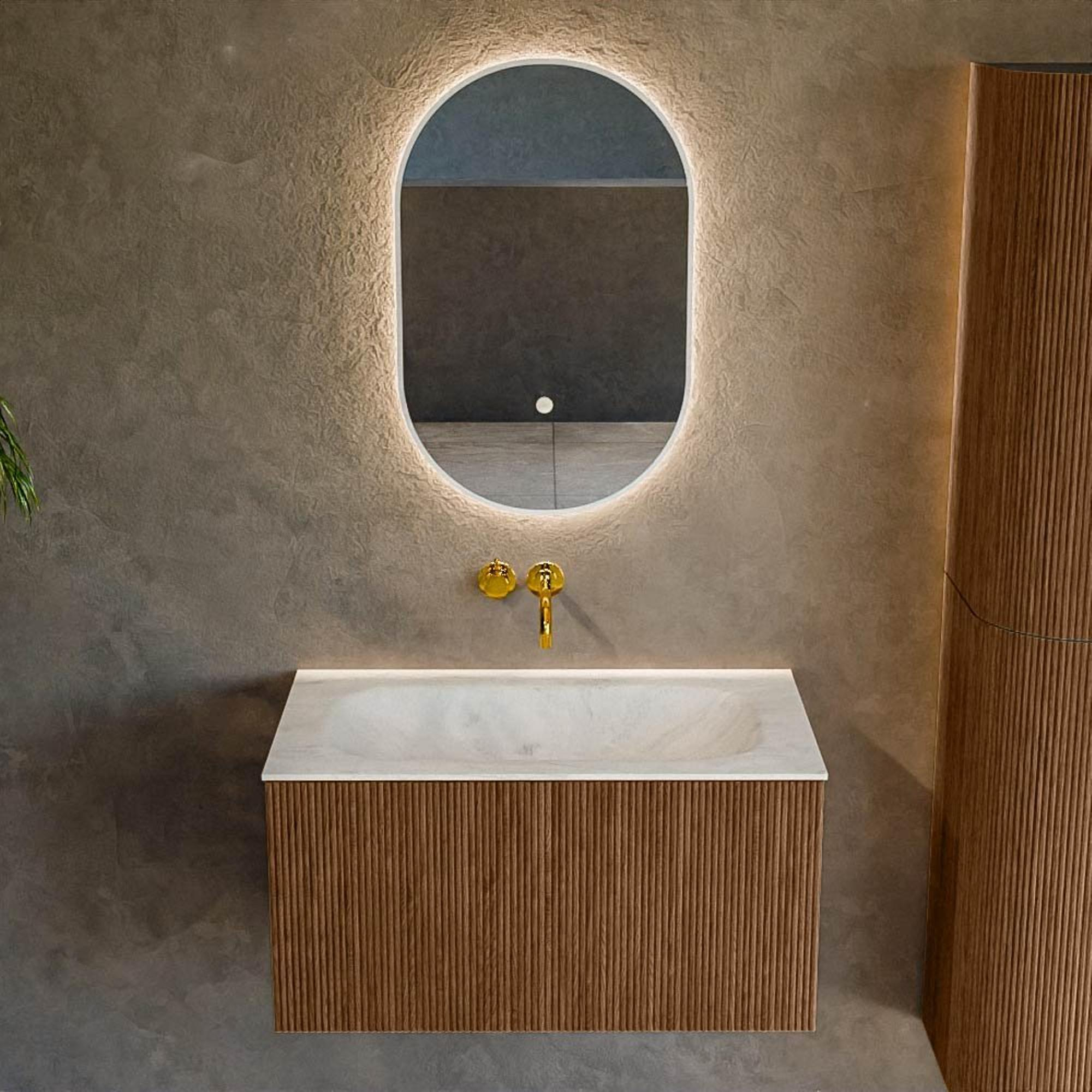 MONDIAZ KURVE-DLUX 80cm badmeubel kleur Walnut met 1 lade. Wastafel BIG SMALL midden zonder kraangat kleur Opalo.