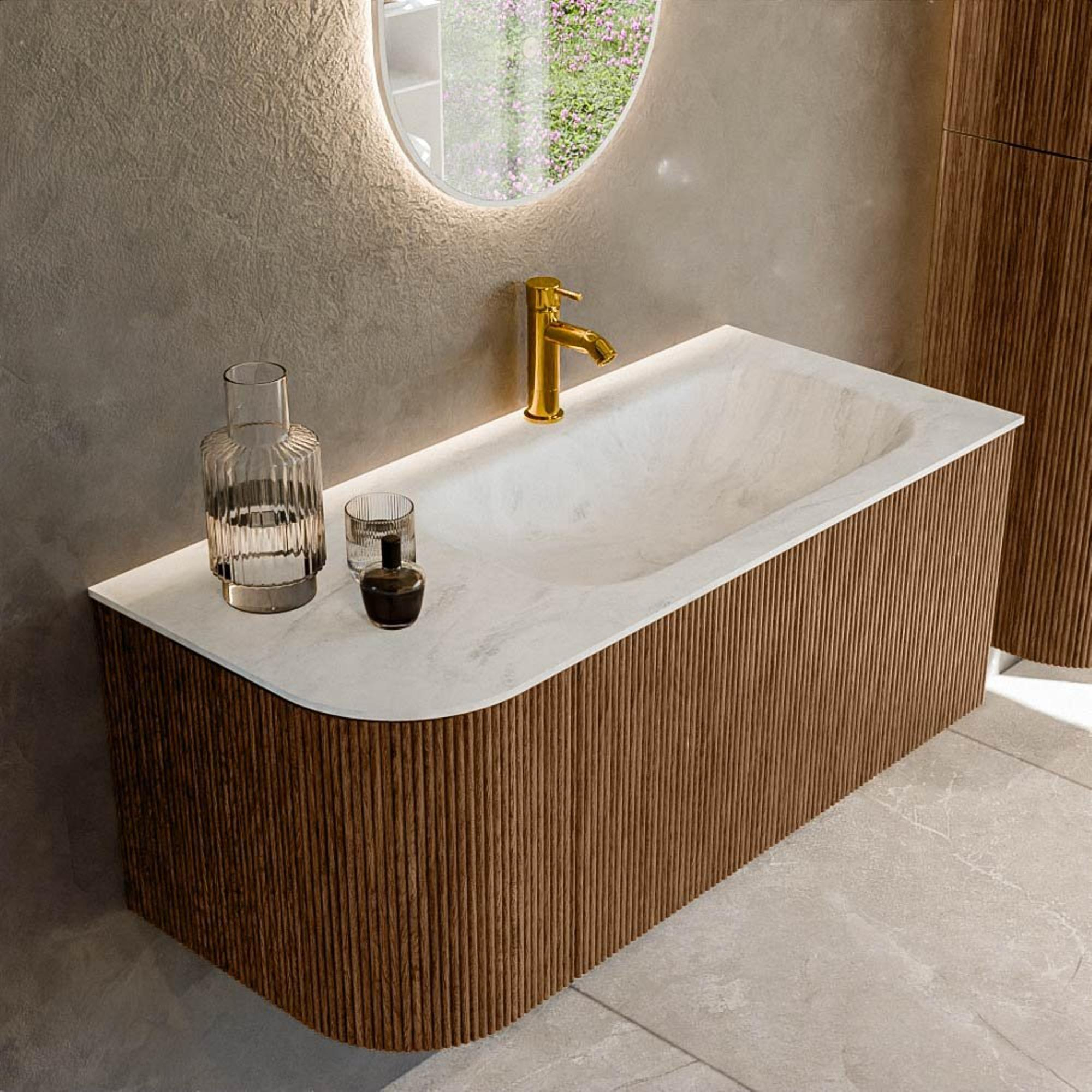 Het ultieme badmeubel dat je badkamer transformeert tot een oase van verfijning. Met zijn halfronde, verticale stroken van massief eiken, verkrijgbaar in de kleuren Oak en Walnut, straalt KURVE vakmanschap uit in elk detail. De zachte rondingen en slim ontworpen deurtjes, elk 40cm hoog, nodigen uit tot gebruik, terwijl de ruimte binnenin optimaal benut wordt dankzij de royale lade van dezelfde hoogte.