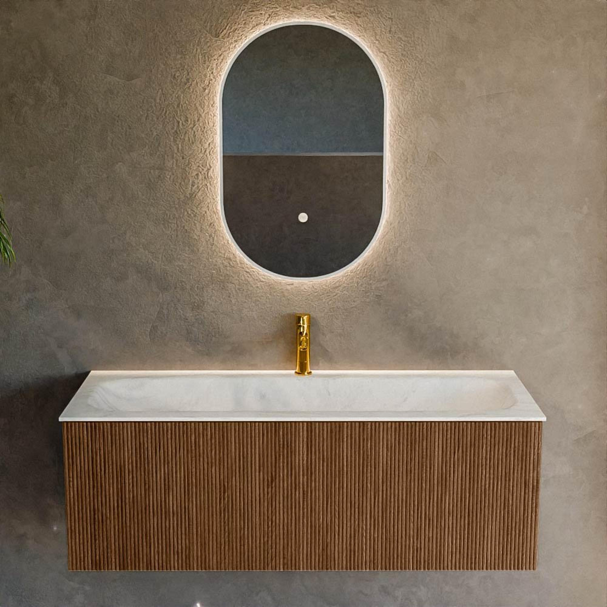 Het ultieme badmeubel dat je badkamer transformeert tot een oase van verfijning. Met zijn halfronde, verticale stroken van massief eiken, verkrijgbaar in de kleuren Oak en Walnut, straalt KURVE vakmanschap uit in elk detail. De zachte rondingen en slim ontworpen deurtjes, elk 40cm hoog, nodigen uit tot gebruik, terwijl de ruimte binnenin optimaal benut wordt dankzij de royale lade van dezelfde hoogte.