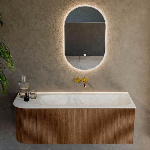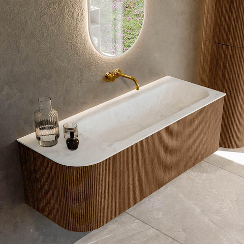 Het ultieme badmeubel dat je badkamer transformeert tot een oase van verfijning. Met zijn halfronde, verticale stroken van massief eiken, verkrijgbaar in de kleuren Oak en Walnut, straalt KURVE vakmanschap uit in elk detail. De zachte rondingen en slim ontworpen deurtjes, elk 40cm hoog, nodigen uit tot gebruik, terwijl de ruimte binnenin optimaal benut wordt dankzij de royale lade van dezelfde hoogte.