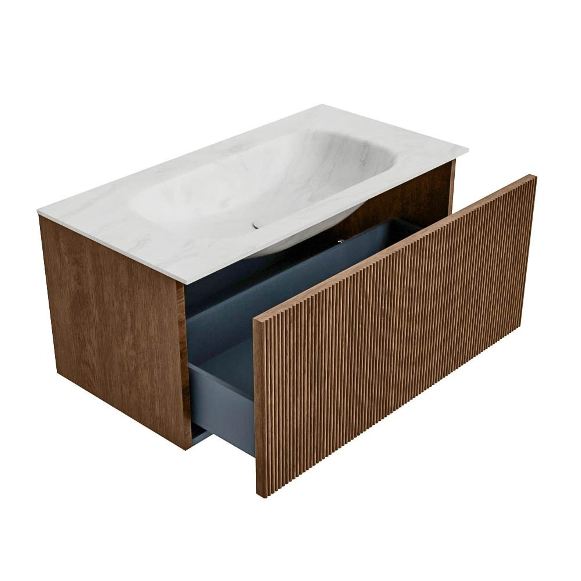 MONDIAZ KURVE-DLUX 90cm badmeubel kleur Walnut met 1 lade. Wastafel BIG SMALL midden 1 kraangat kleur Opalo.