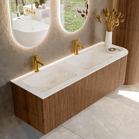 MONDIAZ KURVE-DLUX 145cm badmeubel met module 25 R kleur Walnut met 1 lade en 1 deur. Wastafel LEAF dubbel / links 2 kraangaten kleur Opalo.
