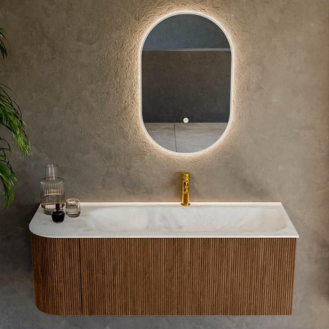 Het ultieme badmeubel dat je badkamer transformeert tot een oase van verfijning. Met zijn halfronde, verticale stroken van massief eiken, verkrijgbaar in de kleuren Oak en Walnut, straalt KURVE vakmanschap uit in elk detail. De zachte rondingen en slim ontworpen deurtjes, elk 40cm hoog, nodigen uit tot gebruik, terwijl de ruimte binnenin optimaal benut wordt dankzij de royale lade van dezelfde hoogte.