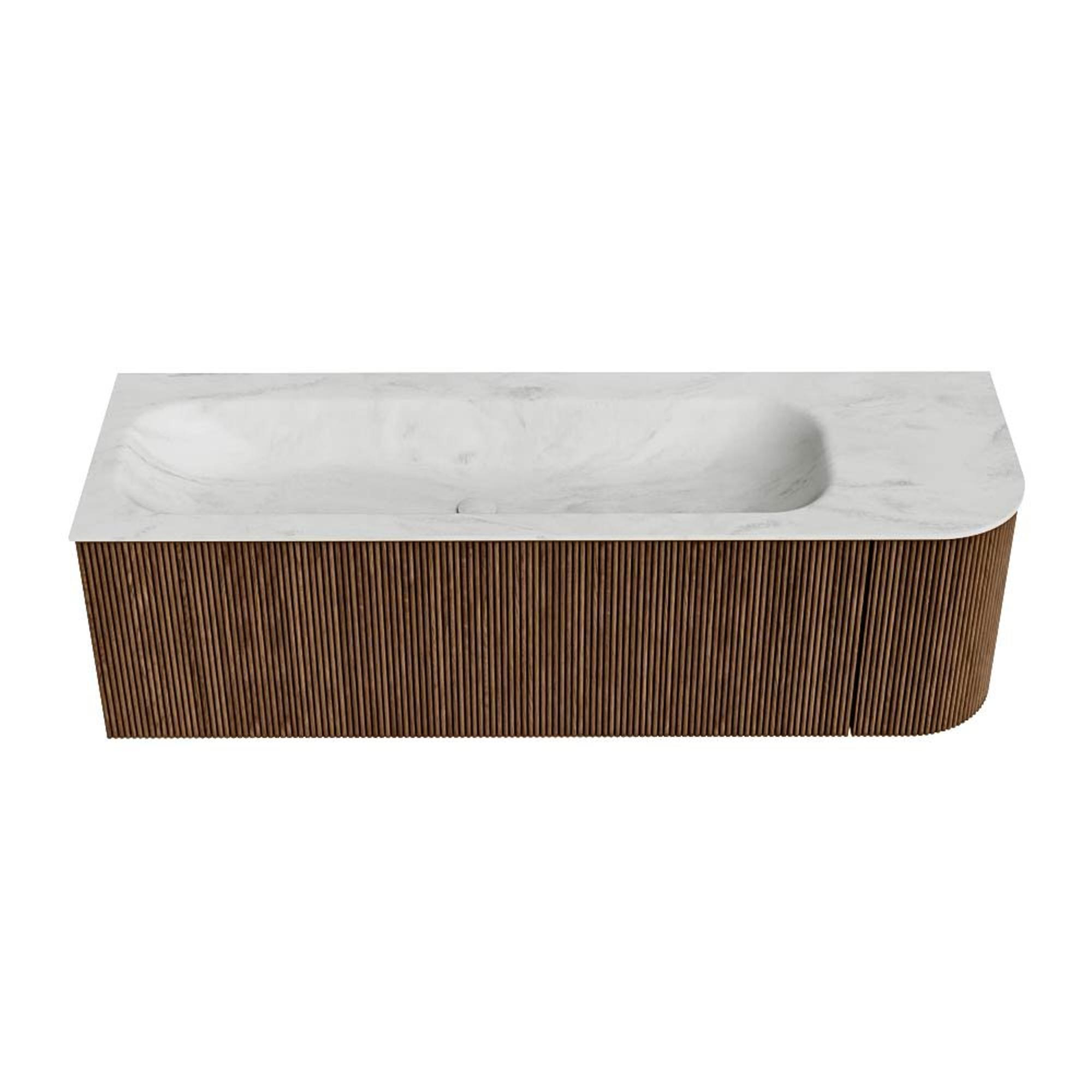 MONDIAZ KURVE-DLUX 145cm badmeubel met module 25 R kleur Walnut met 1 lade en 1 deur. Wastafel BIG LARGE links 2 kraangaten kleur Opalo.