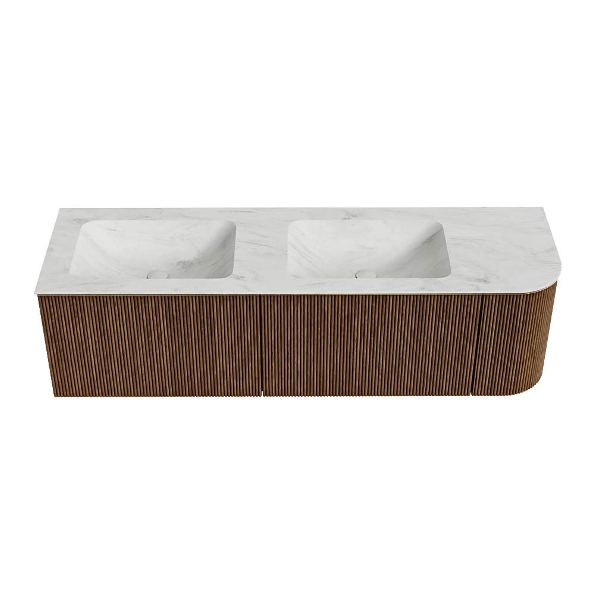 MONDIAZ KURVE-DLUX 155cm badmeubel met module 25 R kleur Walnut met 2 lades en 1 deur. Wastafel LEAF dubbel / links 2 kraangaten kleur Opalo.