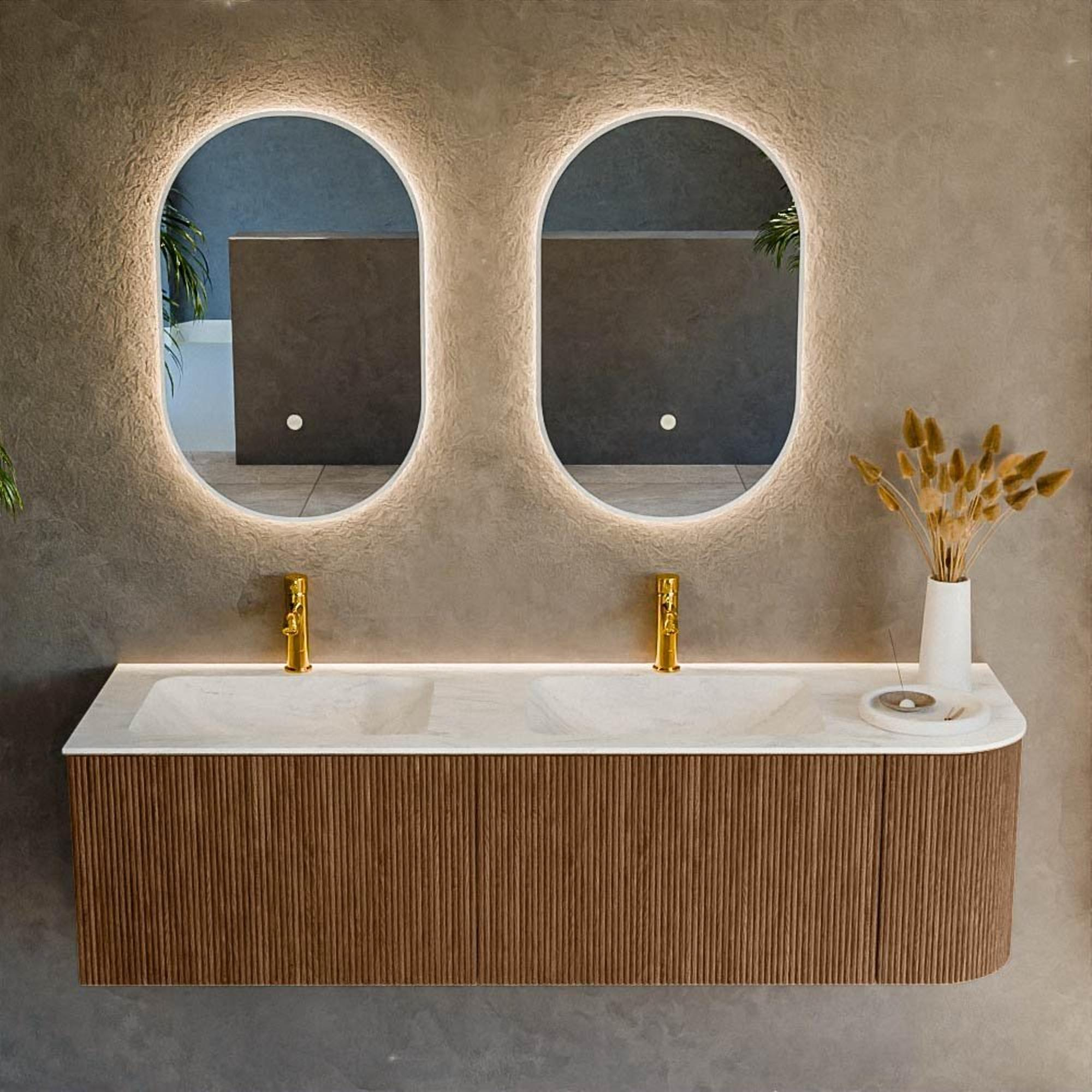 Het ultieme badmeubel dat je badkamer transformeert tot een oase van verfijning. Met zijn halfronde, verticale stroken van massief eiken, verkrijgbaar in de kleuren Oak en Walnut, straalt KURVE vakmanschap uit in elk detail. De zachte rondingen en slim ontworpen deurtjes, elk 40cm hoog, nodigen uit tot gebruik, terwijl de ruimte binnenin optimaal benut wordt dankzij de royale lade van dezelfde hoogte.