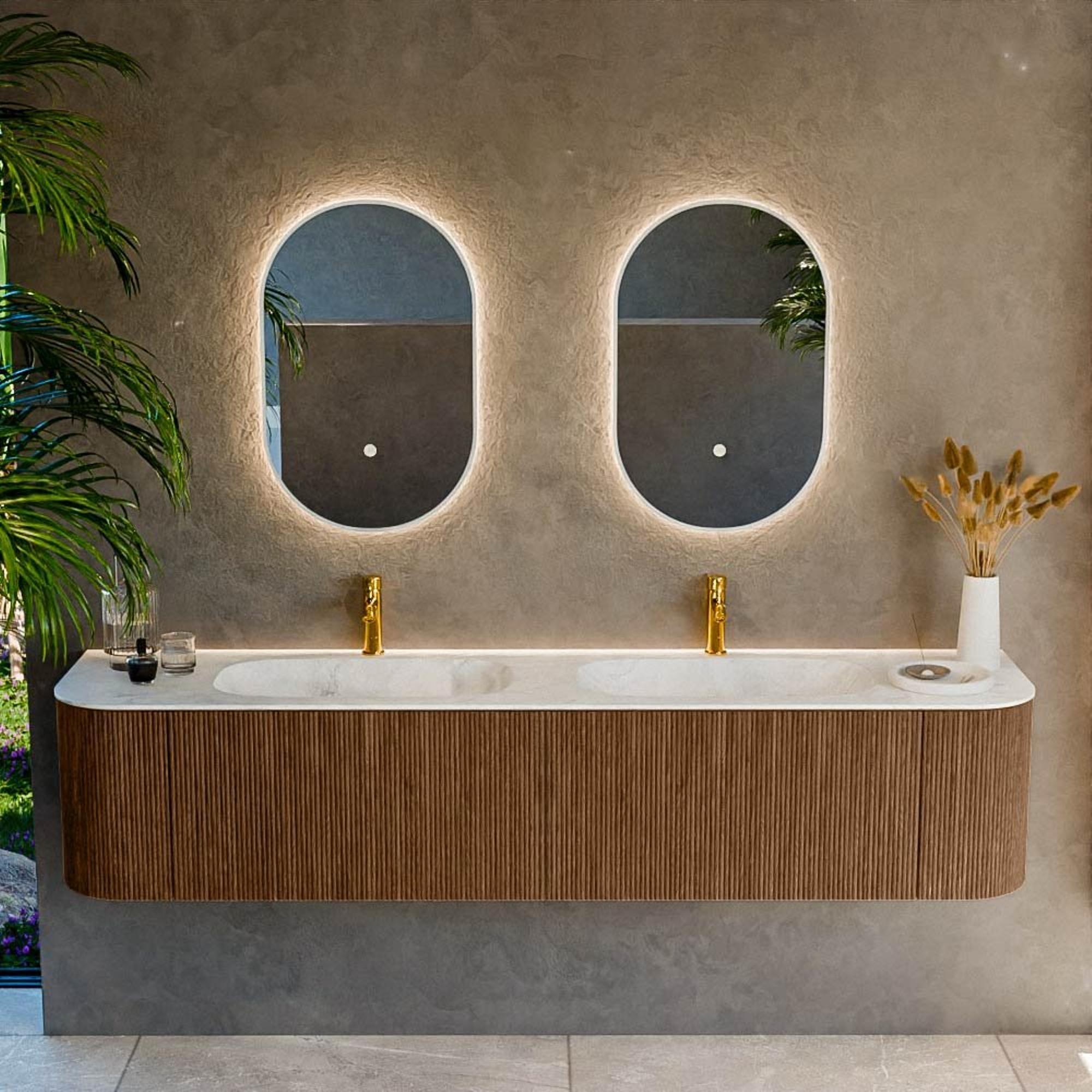 Het ultieme badmeubel dat je badkamer transformeert tot een oase van verfijning. Met zijn halfronde, verticale stroken van massief eiken, verkrijgbaar in de kleuren Oak en Walnut, straalt KURVE vakmanschap uit in elk detail. De zachte rondingen en slim ontworpen deurtjes, elk 40cm hoog, nodigen uit tot gebruik, terwijl de ruimte binnenin optimaal benut wordt dankzij de royale lade van dezelfde hoogte.