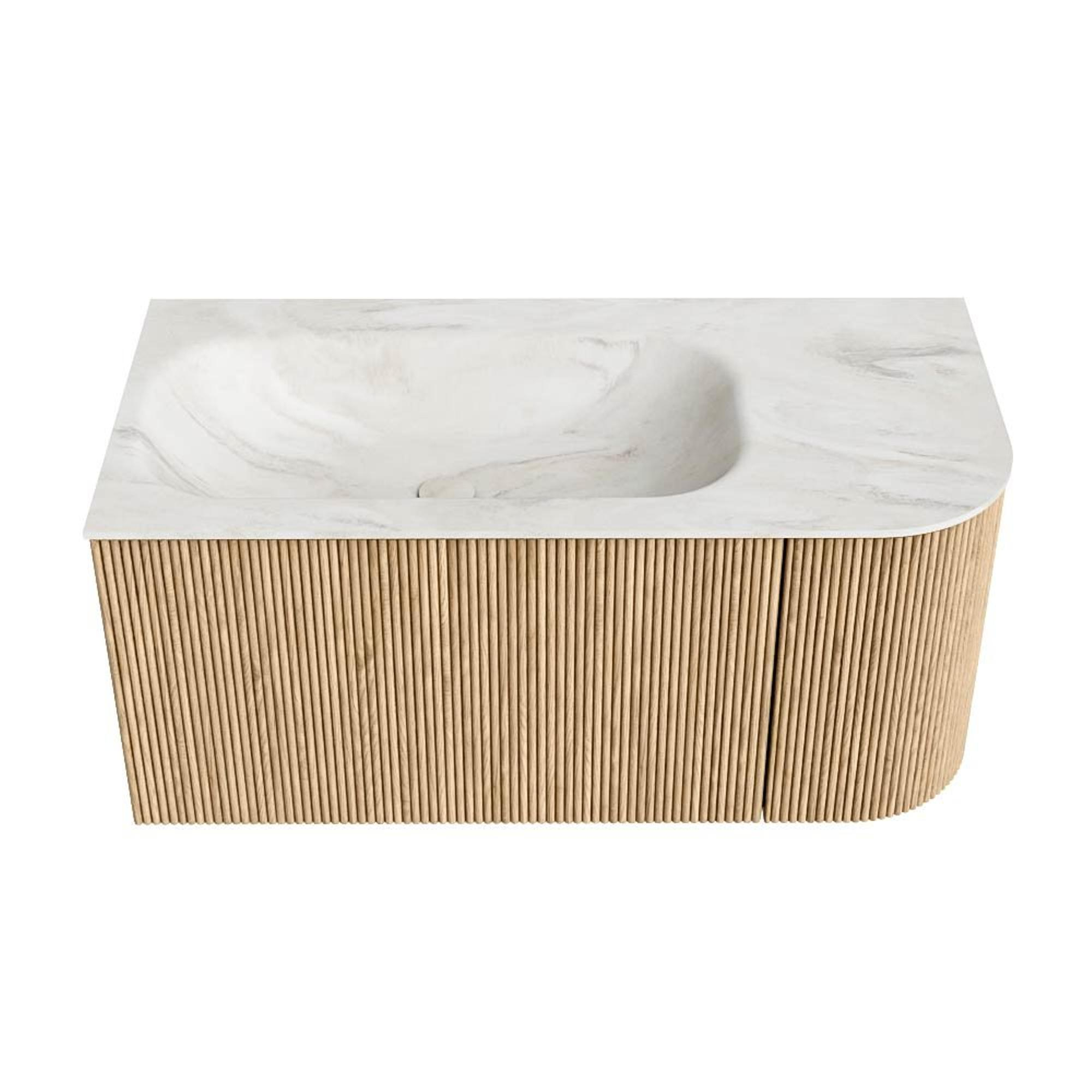 MONDIAZ KURVE-DLUX 95cm badmeubel met module 25 R kleur Oak met 1 lade en 1 deur. Wastafel BIG SMALL links zonder kraangat kleur Ostra.