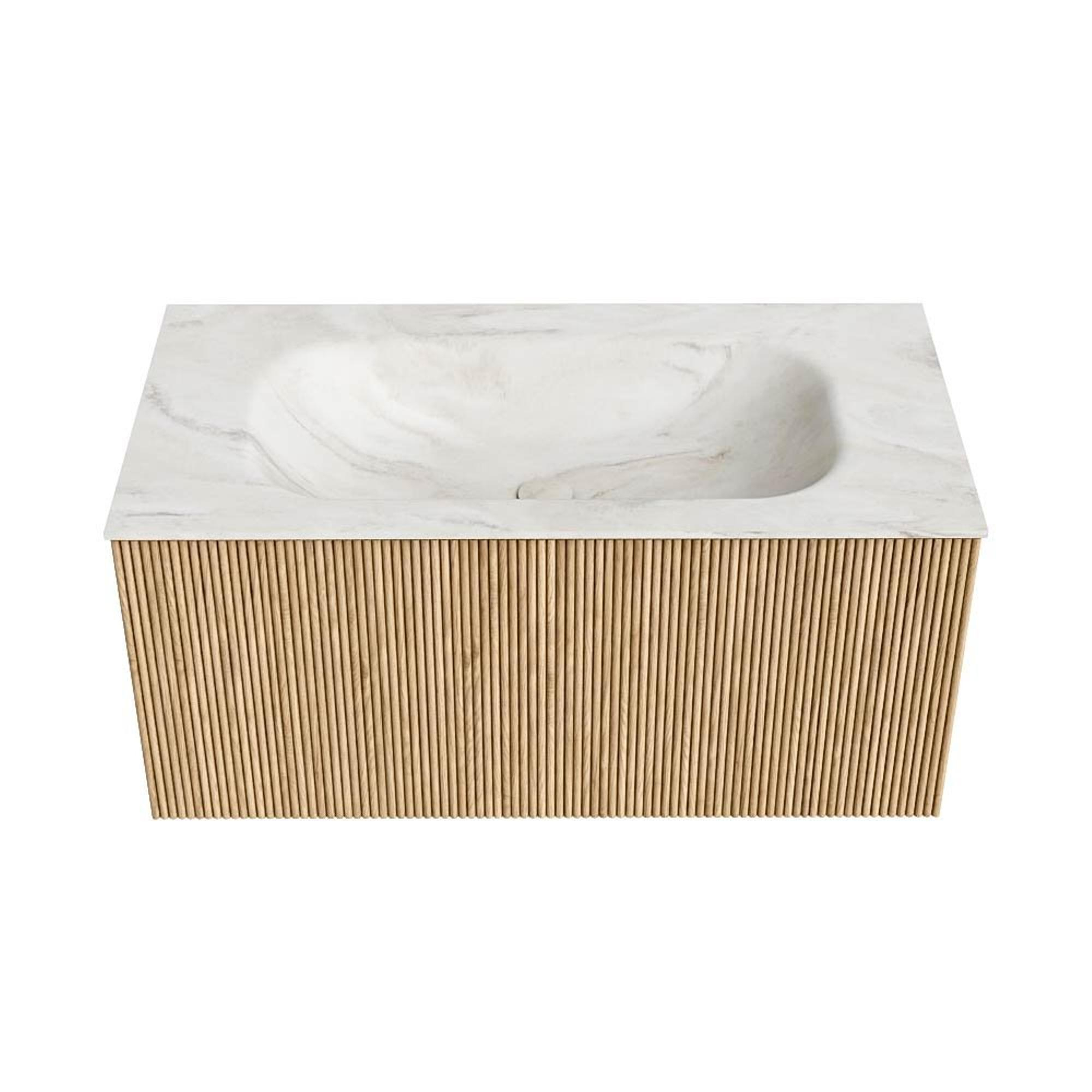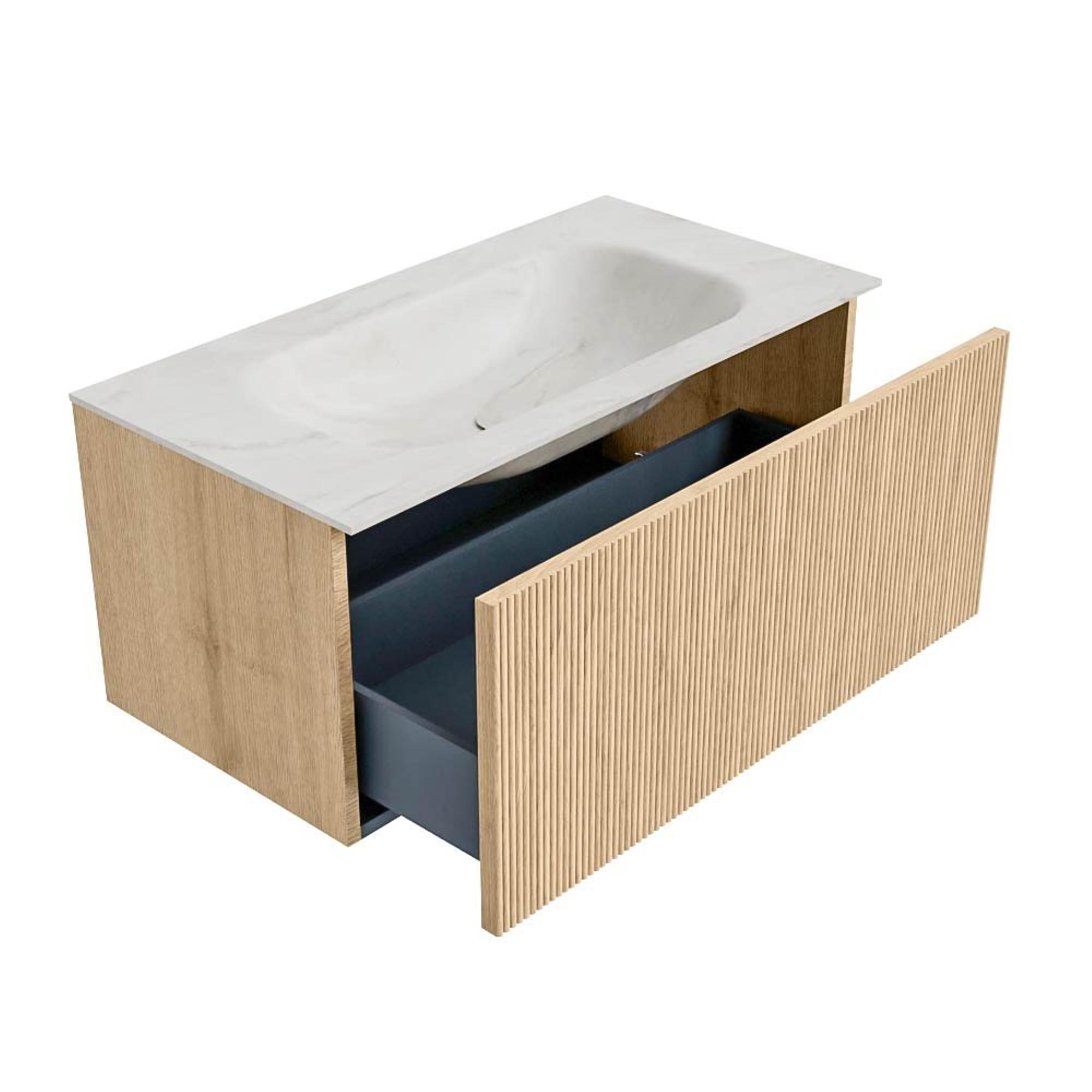 MONDIAZ KURVE-DLUX 90cm badmeubel kleur Oak met 1 lade. Wastafel BIG SMALL midden zonder kraangat kleur Ostra.
