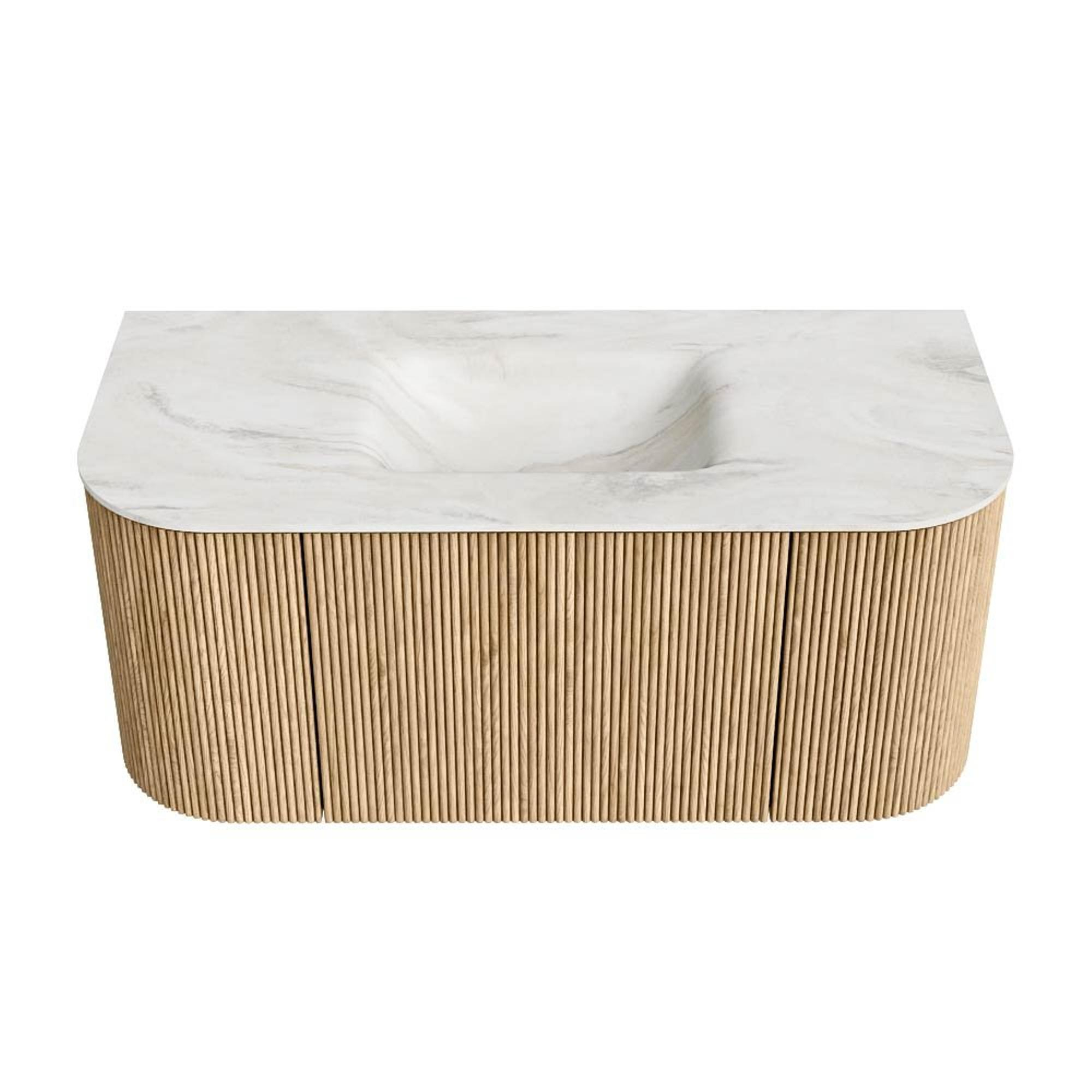 MONDIAZ KURVE-DLUX 100cm badmeubel met module 25 Len R kleur Oak met 1 lade en 2 deuren. Wastafel GRUNNE midden 1 kraangat kleur Ostra.