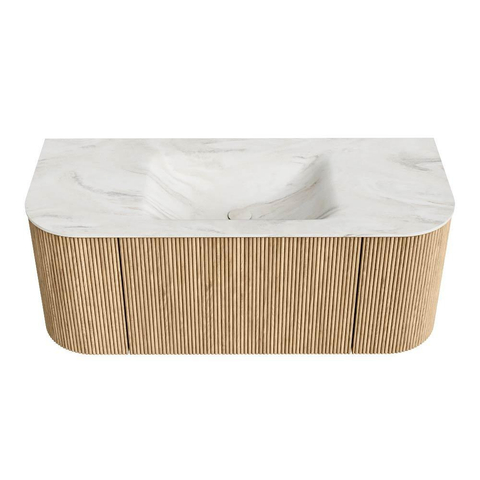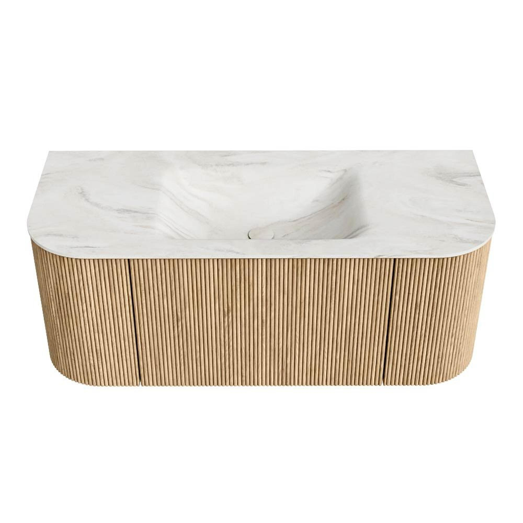 Het ultieme badmeubel dat je badkamer transformeert tot een oase van verfijning. Met zijn halfronde, verticale stroken van massief eiken, verkrijgbaar in de kleuren Oak en Walnut, straalt KURVE vakmanschap uit in elk detail. De zachte rondingen en slim ontworpen deurtjes, elk 40cm hoog, nodigen uit tot gebruik, terwijl de ruimte binnenin optimaal benut wordt dankzij de royale lade van dezelfde hoogte.