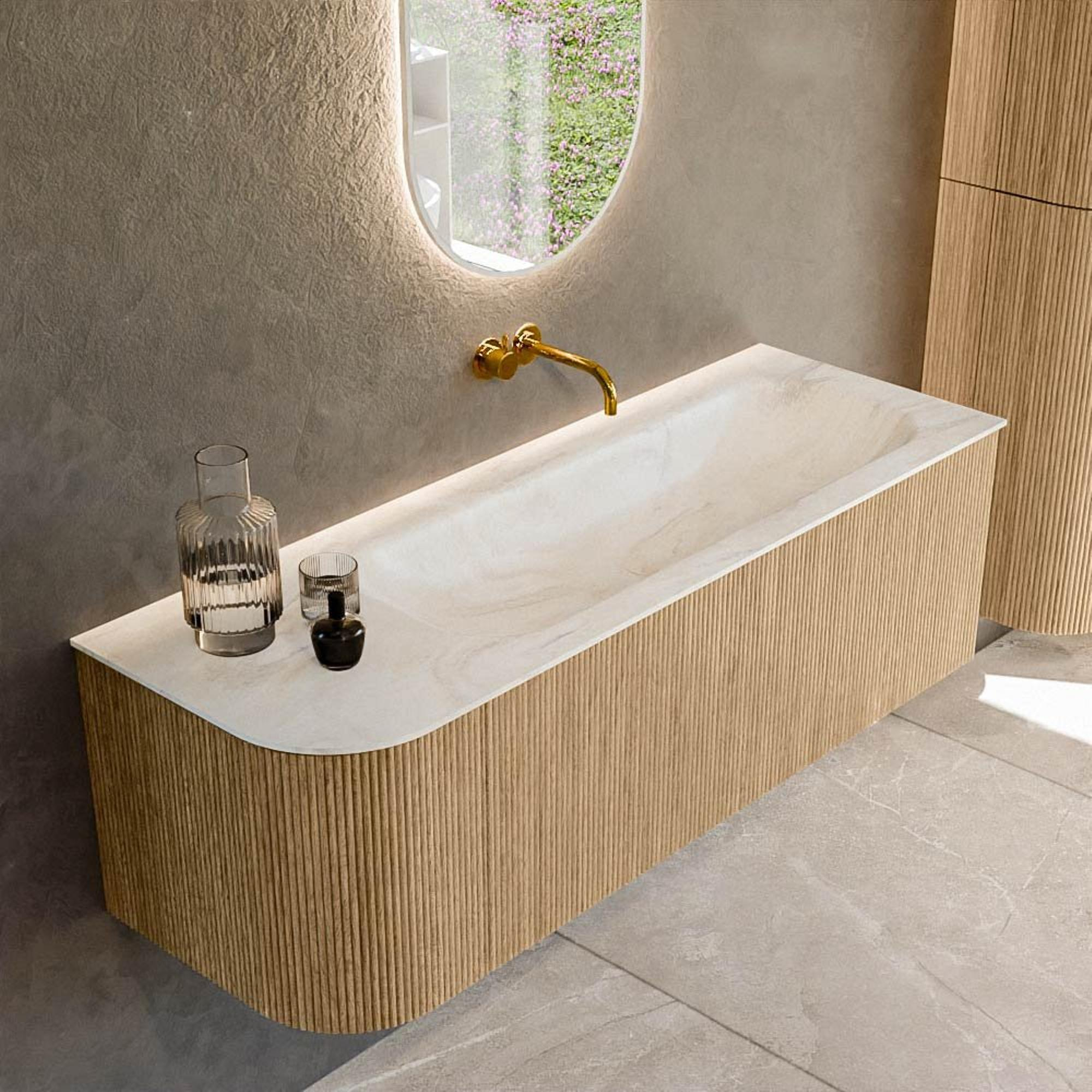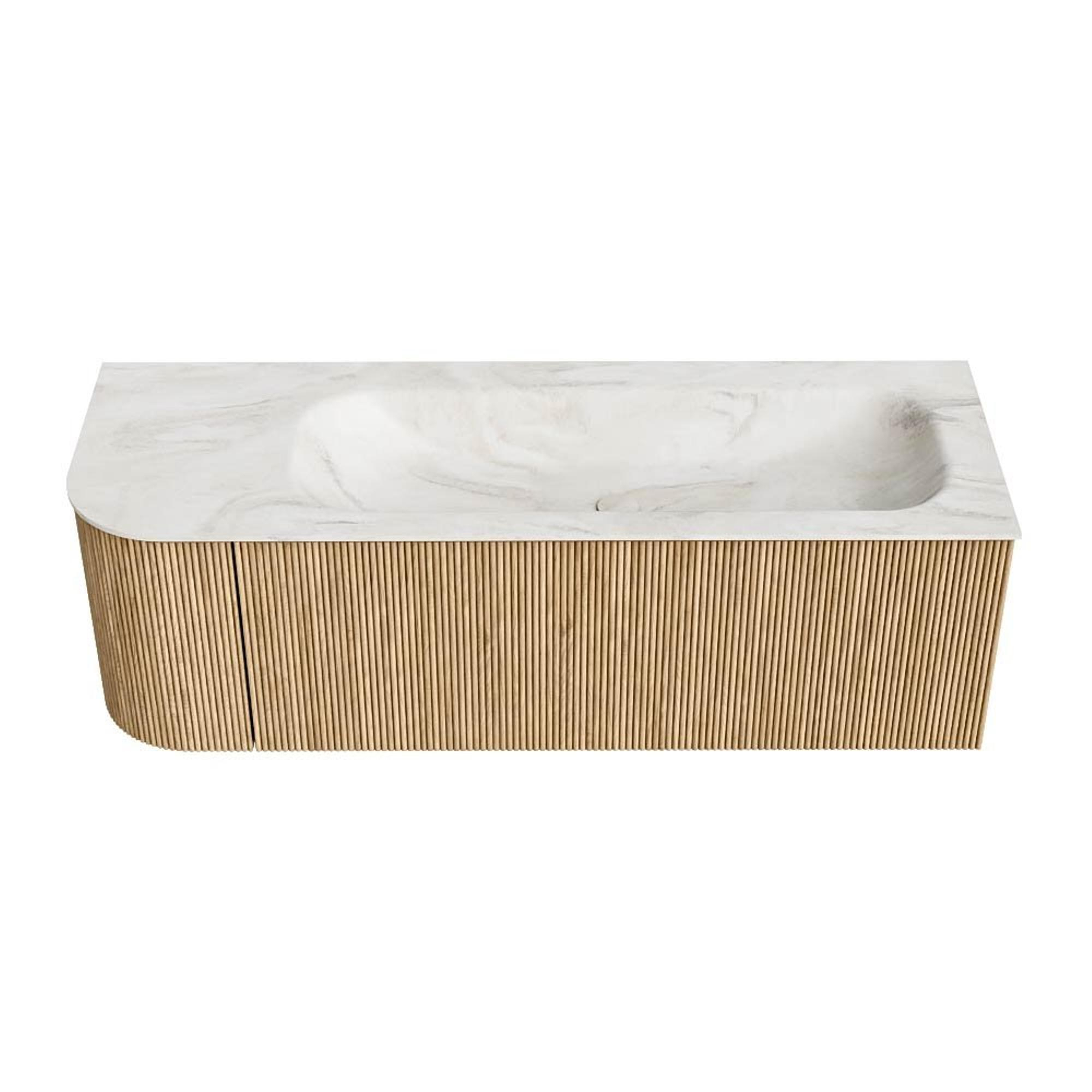 MONDIAZ KURVE-DLUX 135cm badmeubel met module 25 L kleur Oak met 1 lade en 1 deur. Wastafel BIG MEDIUM rechts zonder kraangat kleur Ostra.