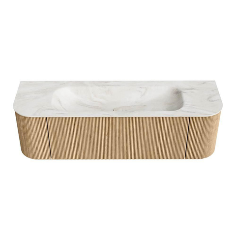 MONDIAZ KURVE-DLUX 150cm badmeubel met module 25 Len R kleur Oak met 1 lade en 2 deuren. Wastafel BIG MEDIUM midden zonder kraangat kleur Ostra.