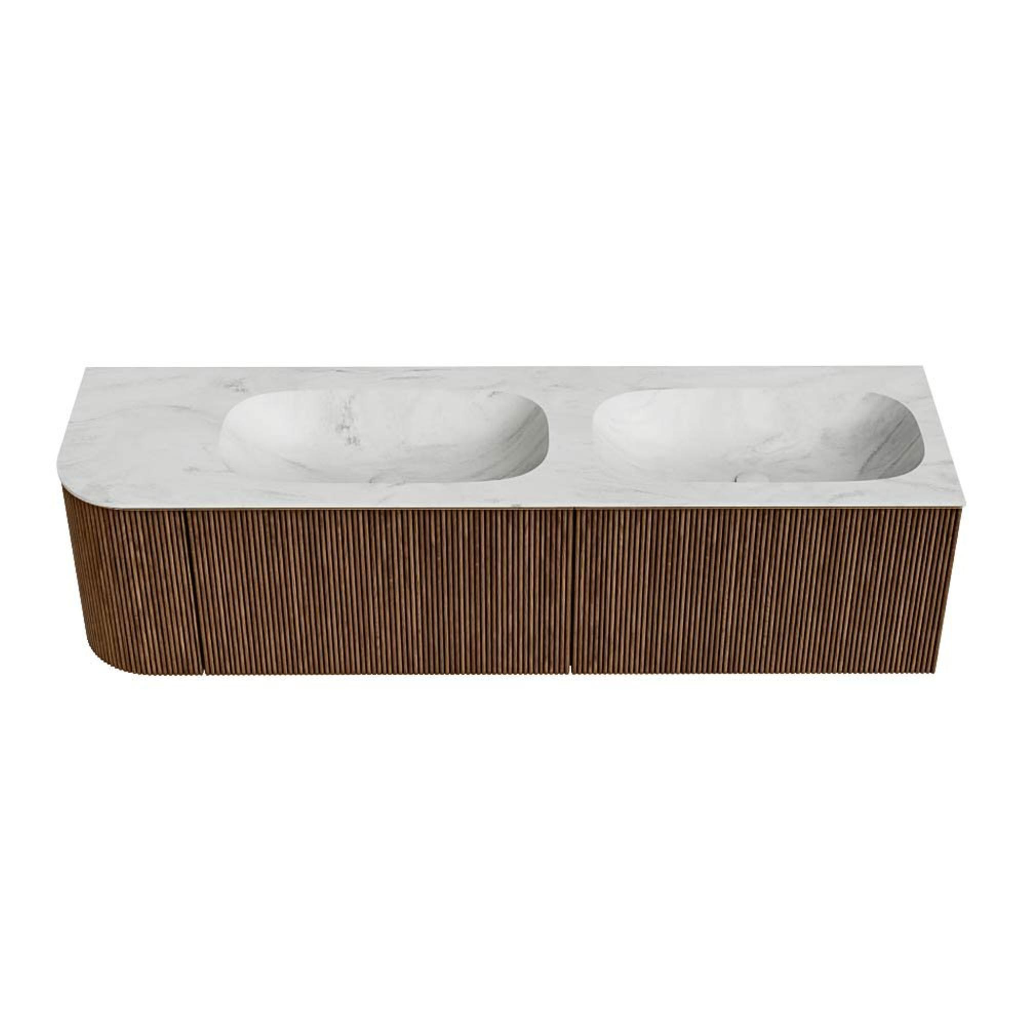 MONDIAZ KURVE-DLUX 165cm badmeubel met module 25 L kleur Walnut met 2 lades en 1 deur. Wastafel STOR SMALL dubbel / rechts 2 kraangaten kleur Opalo.