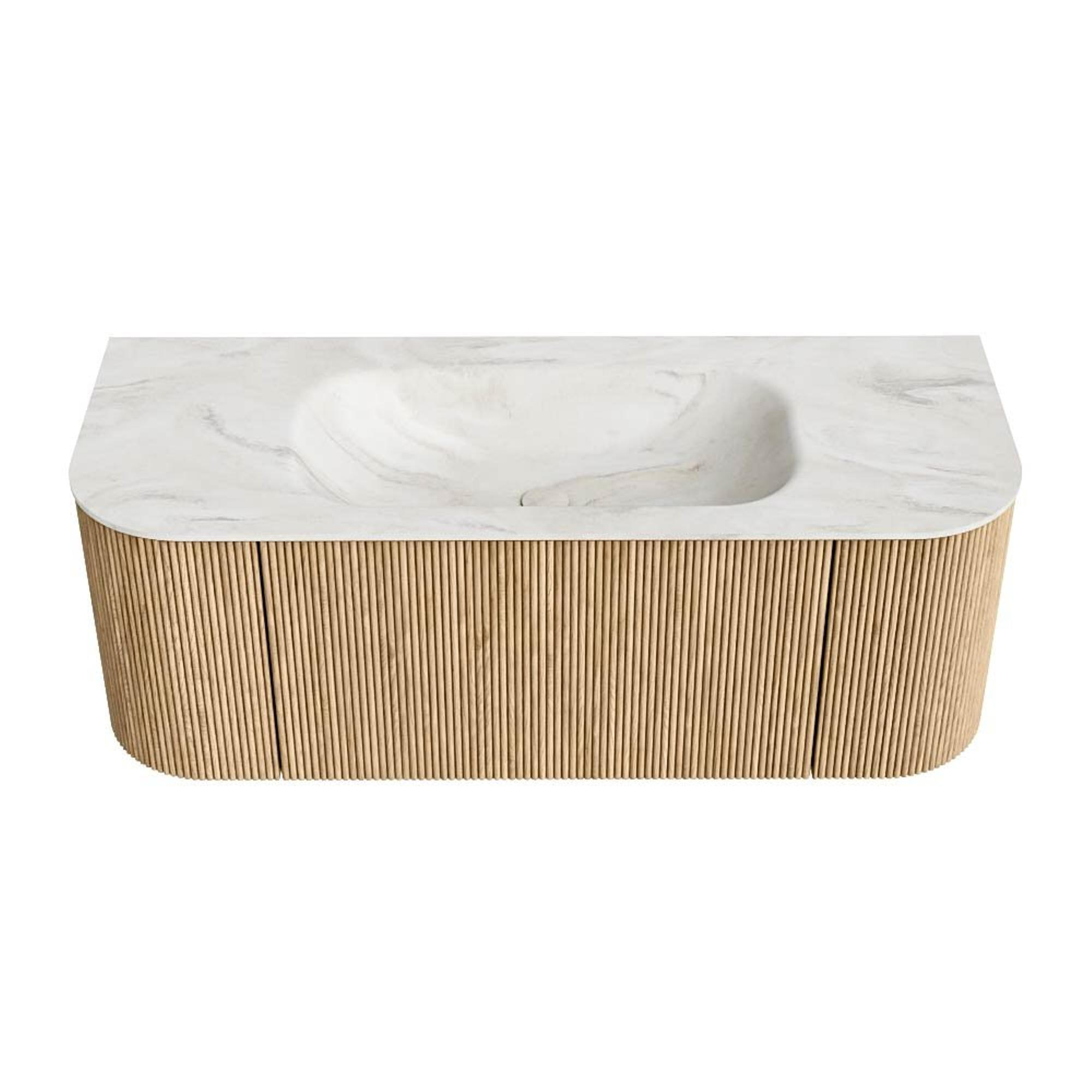 MONDIAZ KURVE-DLUX 120cm badmeubel met module 25 Len R kleur Oak met 1 lade en 2 deuren. Wastafel BIG SMALL midden 1 kraangat kleur Ostra.