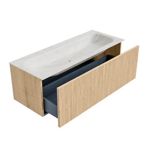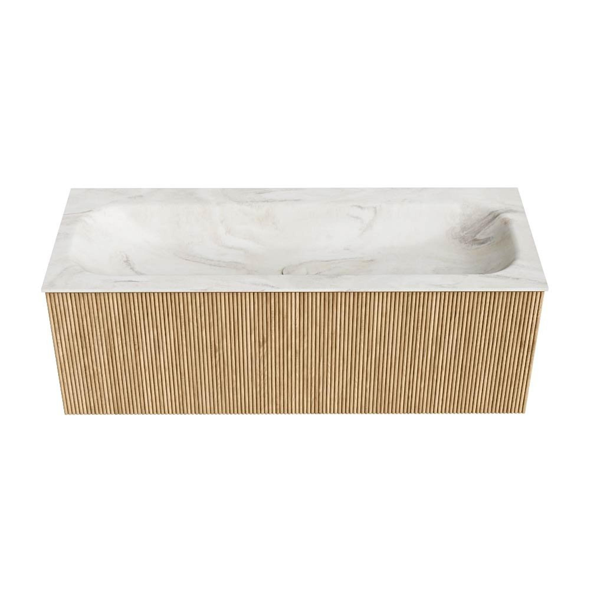 MONDIAZ KURVE-DLUX 120cm badmeubel kleur Oak met 1 lade. Wastafel BIG LARGE midden 2 kraangaten kleur Ostra.