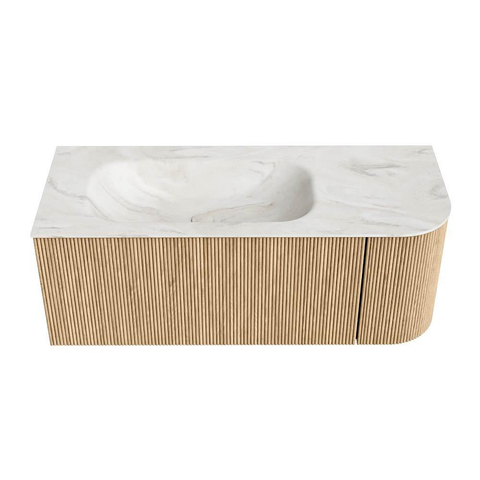 MONDIAZ KURVE-DLUX 115cm badmeubel met module 25 R kleur Oak met 1 lade en 1 deur. Wastafel BIG SMALL links 1 kraangat kleur Ostra.