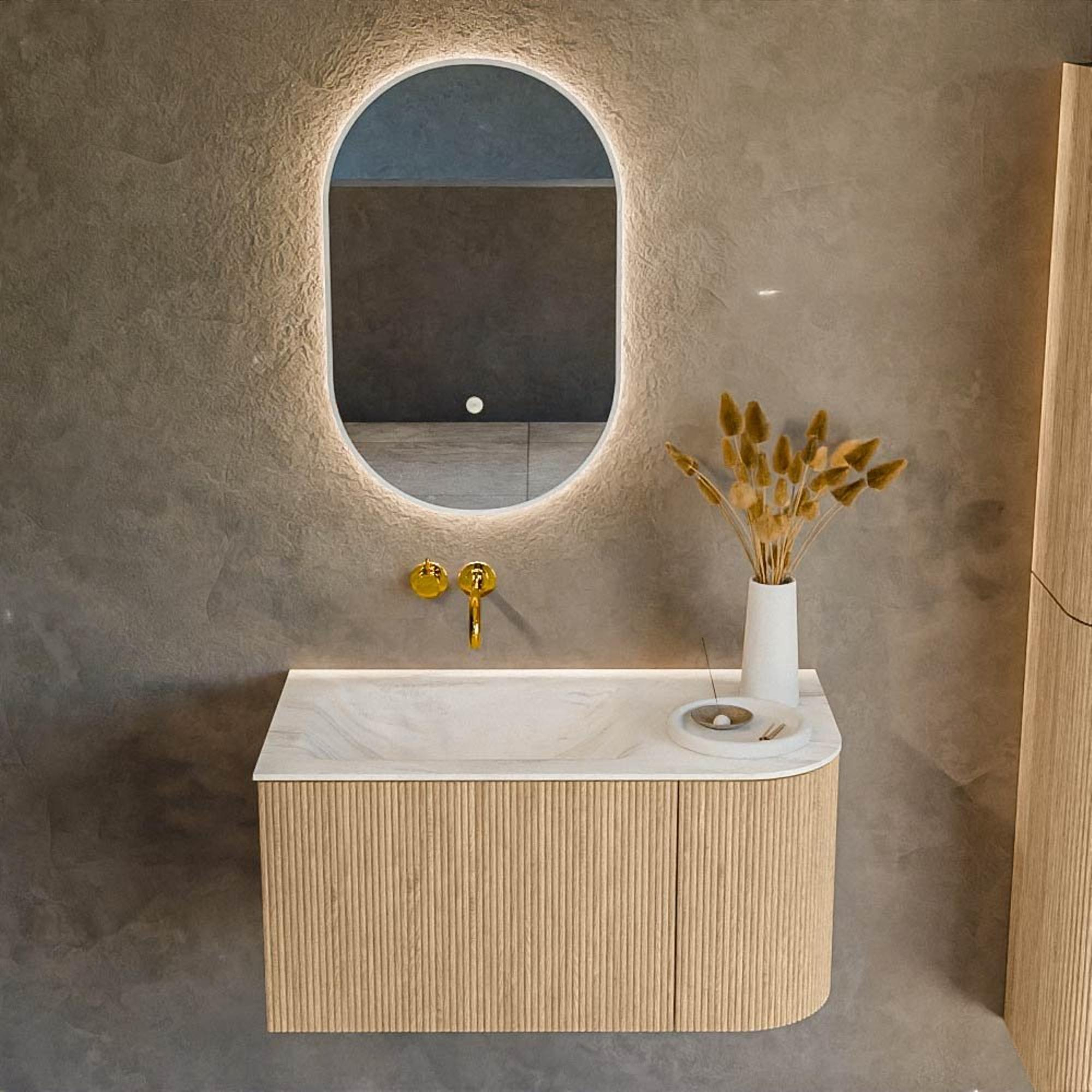 Het ultieme badmeubel dat je badkamer transformeert tot een oase van verfijning. Met zijn halfronde, verticale stroken van massief eiken, verkrijgbaar in de kleuren Oak en Walnut, straalt KURVE vakmanschap uit in elk detail. De zachte rondingen en slim ontworpen deurtjes, elk 40cm hoog, nodigen uit tot gebruik, terwijl de ruimte binnenin optimaal benut wordt dankzij de royale lade van dezelfde hoogte.
