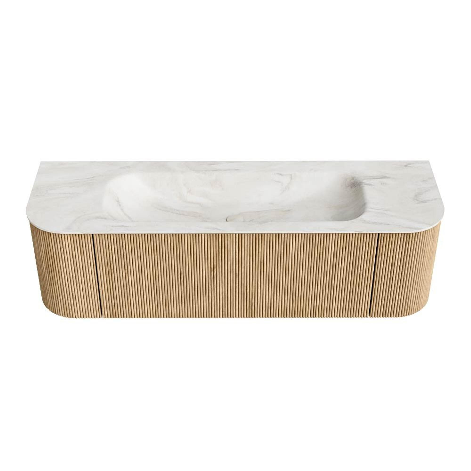 MONDIAZ KURVE-DLUX 150cm badmeubel met module 25 Len R kleur Oak met 1 lade en 2 deuren. Wastafel BIG MEDIUM midden 1 kraangat kleur Ostra.
