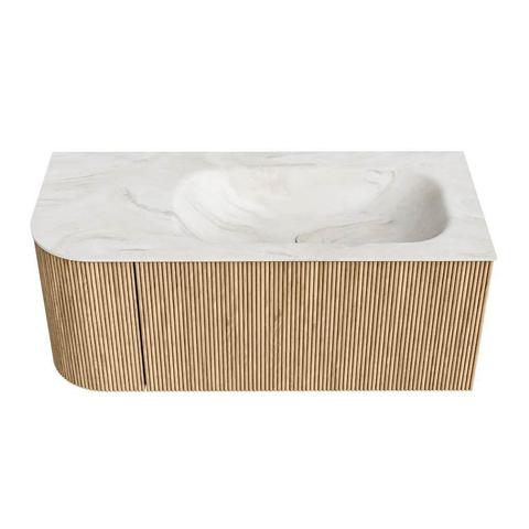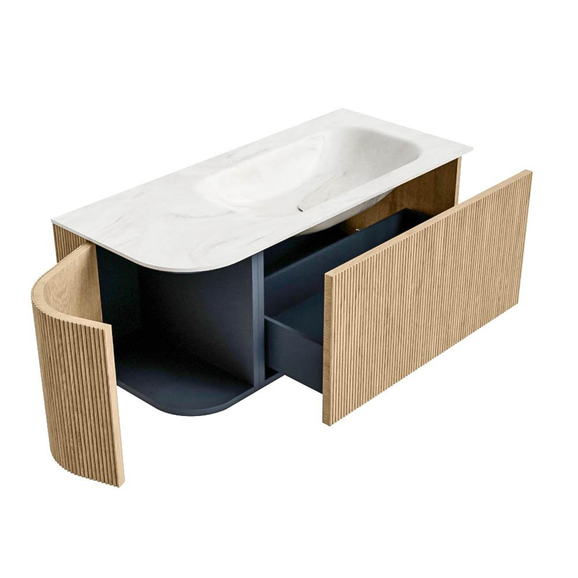 Het ultieme badmeubel dat je badkamer transformeert tot een oase van verfijning. Met zijn halfronde, verticale stroken van massief eiken, verkrijgbaar in de kleuren Oak en Walnut, straalt KURVE vakmanschap uit in elk detail. De zachte rondingen en slim ontworpen deurtjes, elk 40cm hoog, nodigen uit tot gebruik, terwijl de ruimte binnenin optimaal benut wordt dankzij de royale lade van dezelfde hoogte.