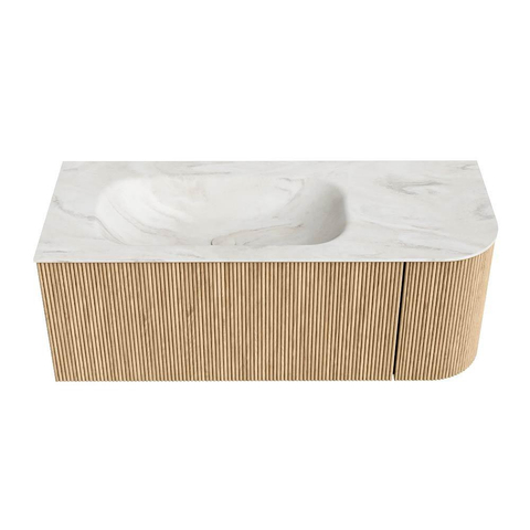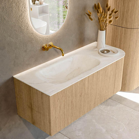 MONDIAZ KURVE-DLUX 115cm badmeubel met module 25 R kleur Oak met 1 lade en 1 deur. Wastafel BIG SMALL links zonder kraangat kleur Ostra.