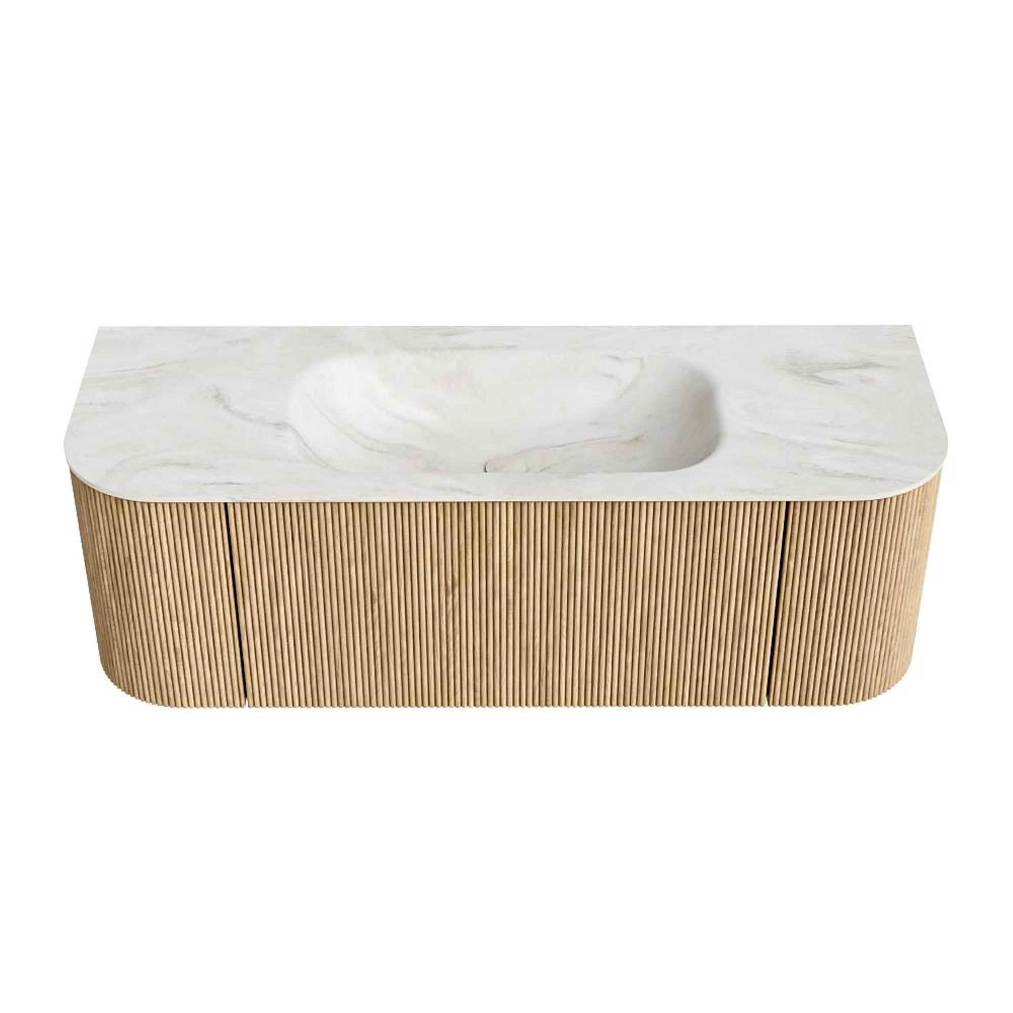 MONDIAZ KURVE-DLUX 130cm badmeubel met module 25 Len R kleur Oak met 1 lade en 2 deuren. Wastafel BIG SMALL midden 1 kraangat kleur Ostra.