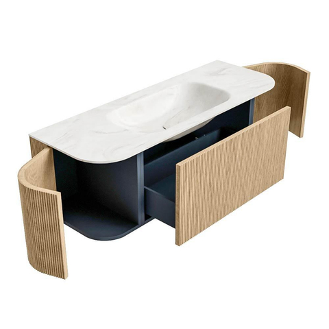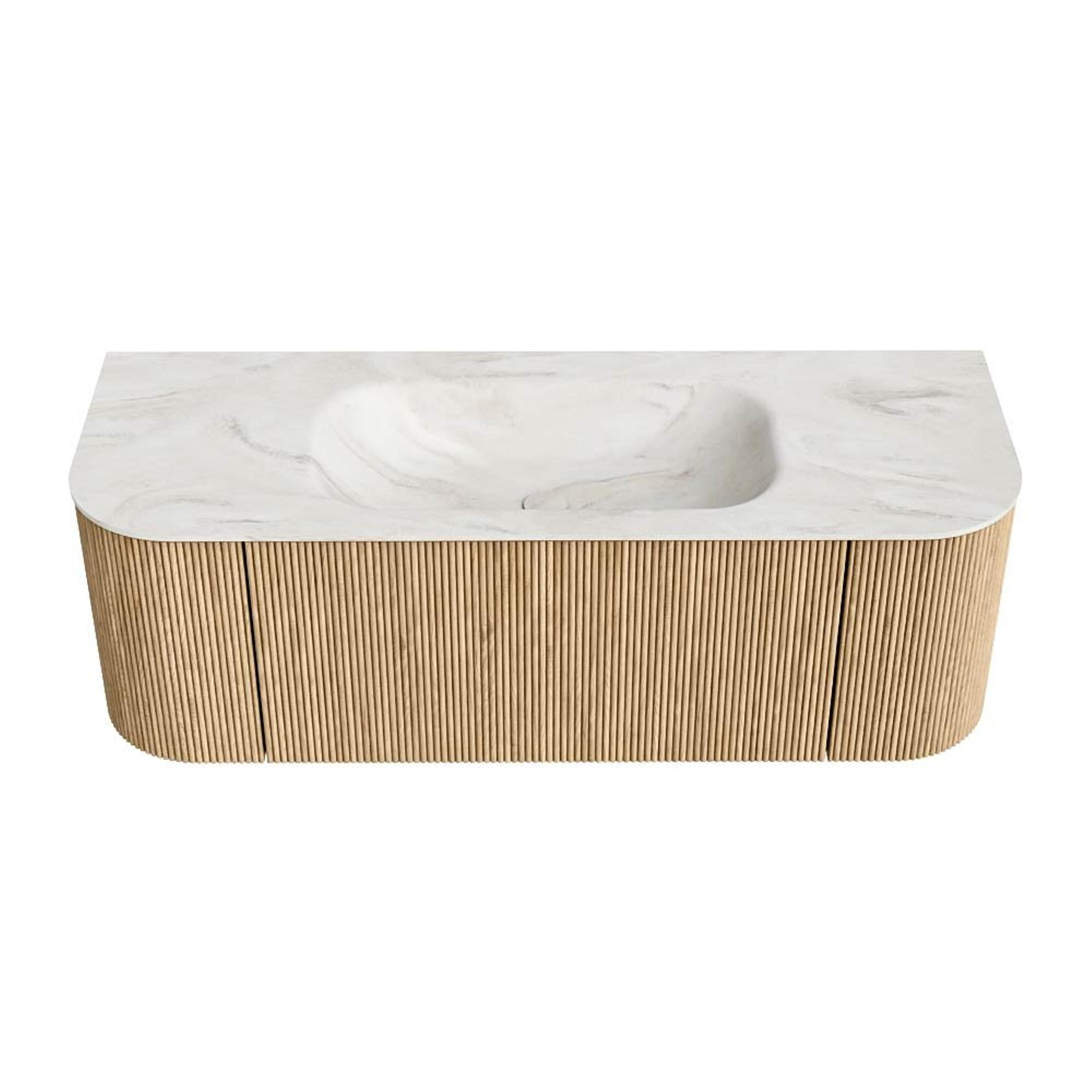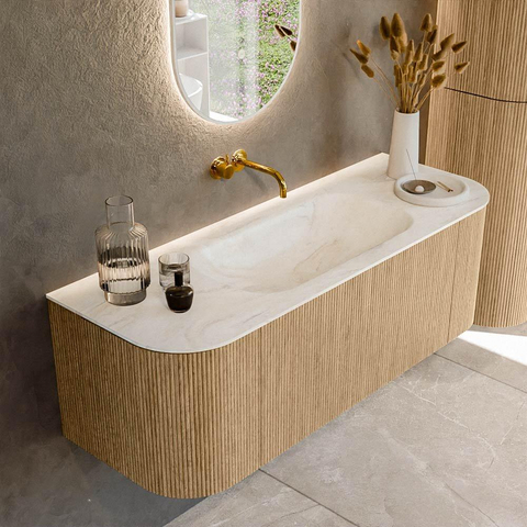 MONDIAZ KURVE-DLUX 130cm badmeubel met module 25 Len R kleur Oak met 1 lade en 2 deuren. Wastafel BIG SMALL midden zonder kraangat kleur Ostra.