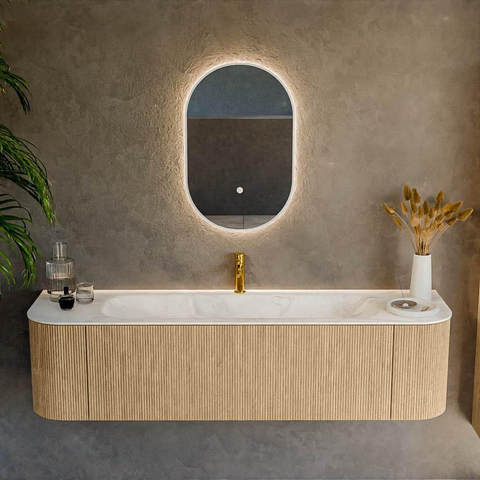 Het ultieme badmeubel dat je badkamer transformeert tot een oase van verfijning. Met zijn halfronde, verticale stroken van massief eiken, verkrijgbaar in de kleuren Oak en Walnut, straalt KURVE vakmanschap uit in elk detail. De zachte rondingen en slim ontworpen deurtjes, elk 40cm hoog, nodigen uit tot gebruik, terwijl de ruimte binnenin optimaal benut wordt dankzij de royale lade van dezelfde hoogte.