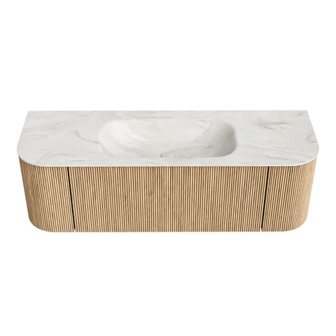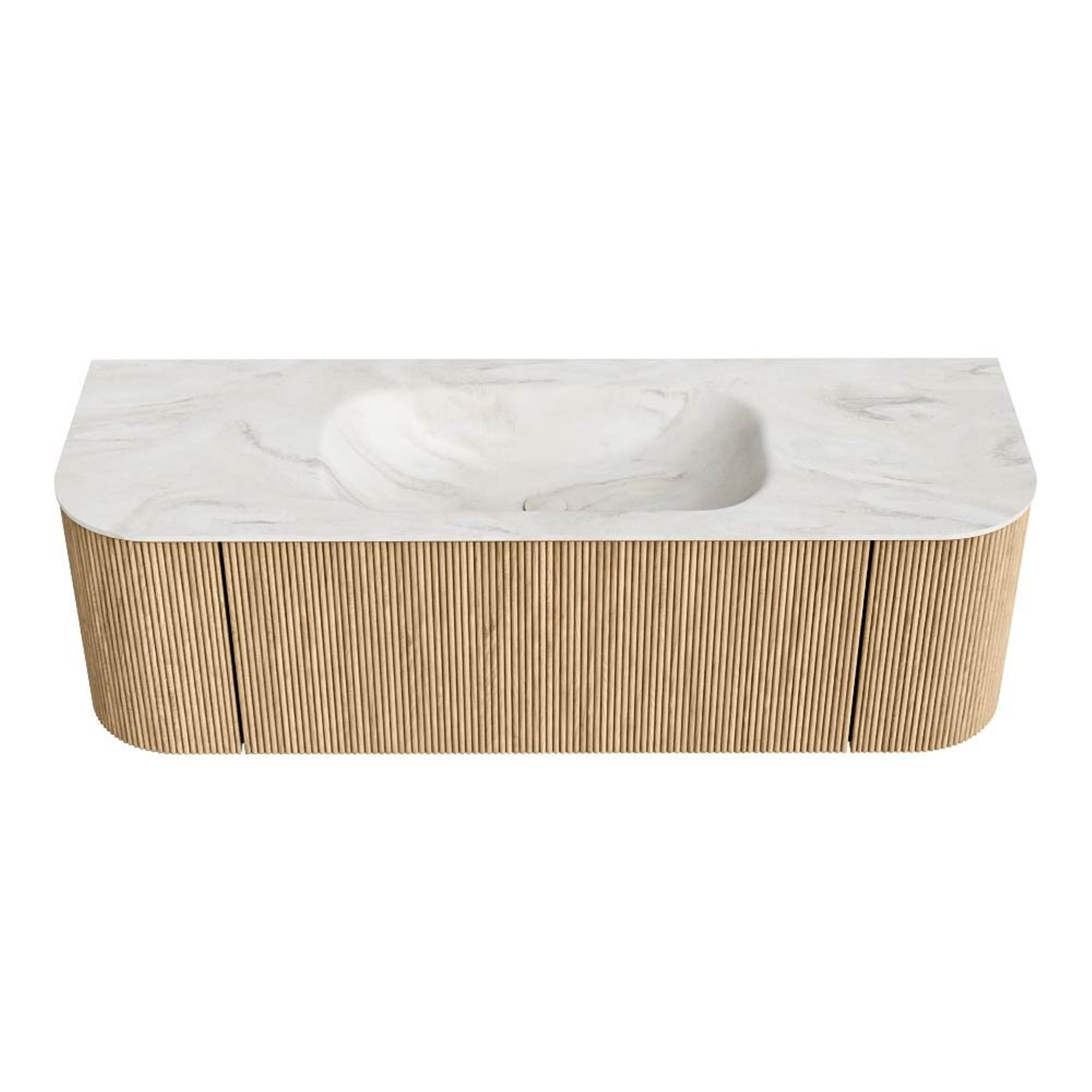 MONDIAZ KURVE-DLUX 140cm badmeubel met module 25 Len R kleur Oak met 1 lade en 2 deuren. Wastafel BIG SMALL midden zonder kraangat kleur Ostra.