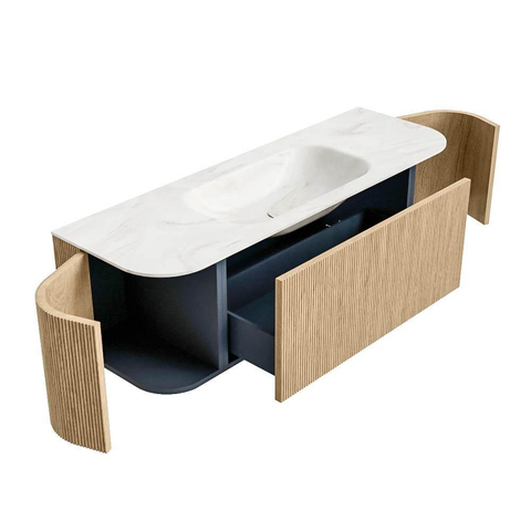 Het ultieme badmeubel dat je badkamer transformeert tot een oase van verfijning. Met zijn halfronde, verticale stroken van massief eiken, verkrijgbaar in de kleuren Oak en Walnut, straalt KURVE vakmanschap uit in elk detail. De zachte rondingen en slim ontworpen deurtjes, elk 40cm hoog, nodigen uit tot gebruik, terwijl de ruimte binnenin optimaal benut wordt dankzij de royale lade van dezelfde hoogte.