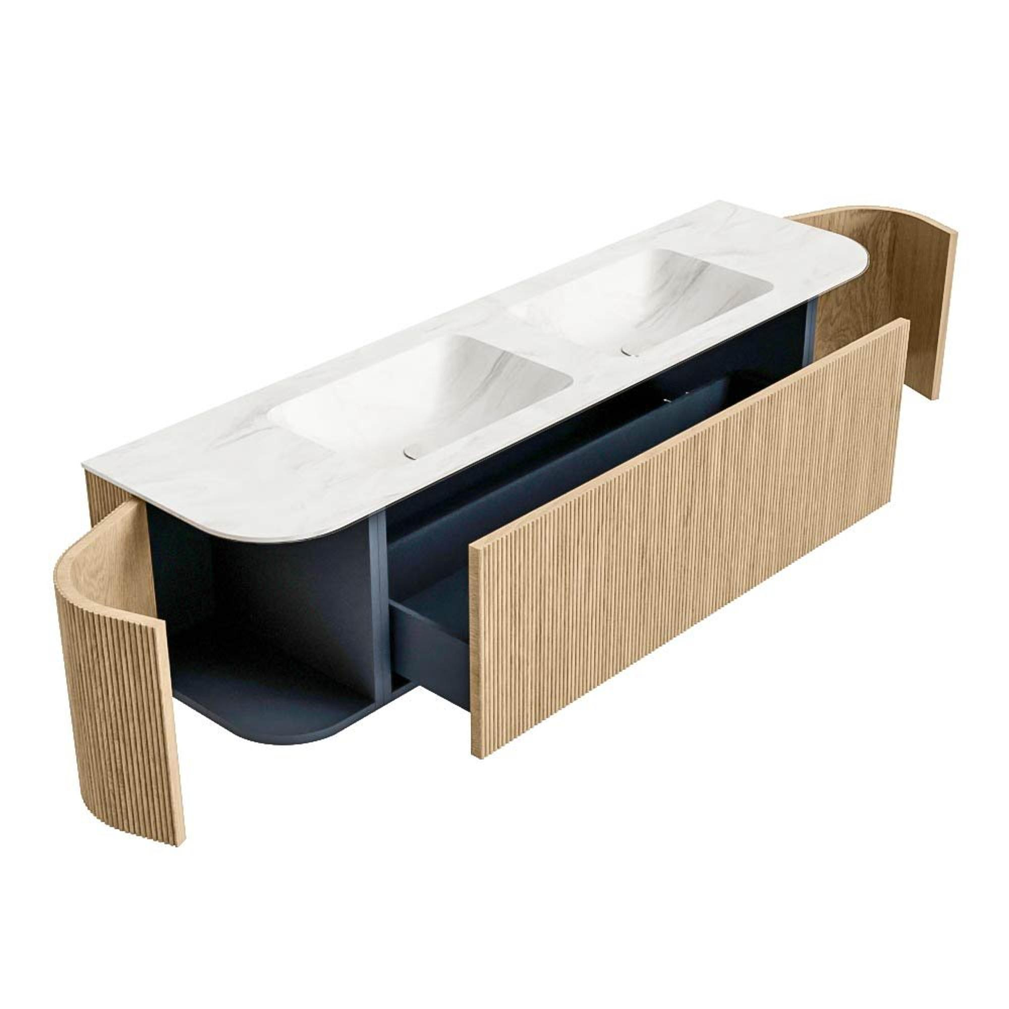 Het ultieme badmeubel dat je badkamer transformeert tot een oase van verfijning. Met zijn halfronde, verticale stroken van massief eiken, verkrijgbaar in de kleuren Oak en Walnut, straalt KURVE vakmanschap uit in elk detail. De zachte rondingen en slim ontworpen deurtjes, elk 40cm hoog, nodigen uit tot gebruik, terwijl de ruimte binnenin optimaal benut wordt dankzij de royale lade van dezelfde hoogte.