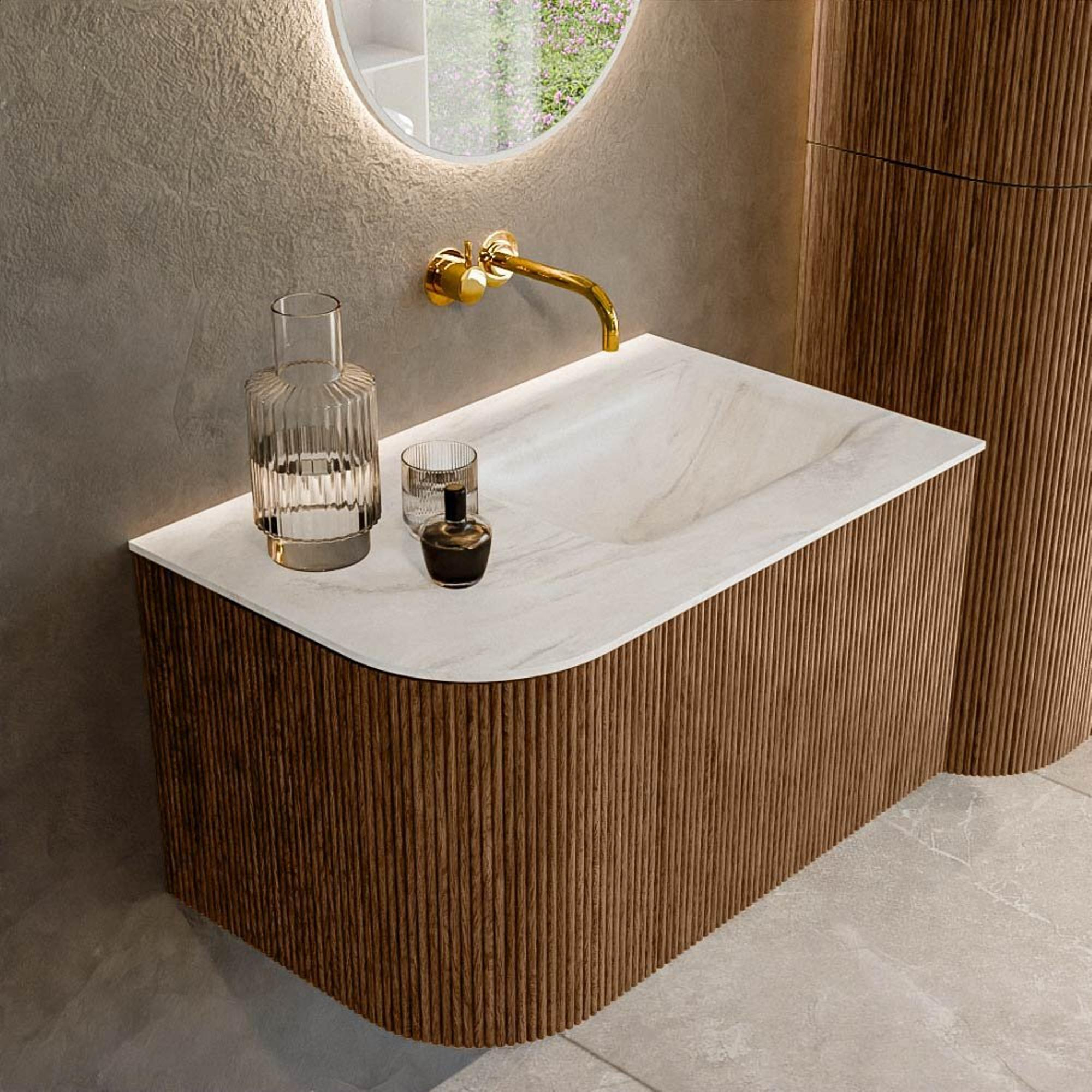 MONDIAZ KURVE-DLUX 75cm badmeubel met module 25 L kleur Walnut met 1 lade en 1 deur. Wastafel GRUNNE rechts zonder kraangat kleur Ostra.