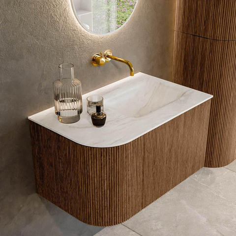 Het ultieme badmeubel dat je badkamer transformeert tot een oase van verfijning. Met zijn halfronde, verticale stroken van massief eiken, verkrijgbaar in de kleuren Oak en Walnut, straalt KURVE vakmanschap uit in elk detail. De zachte rondingen en slim ontworpen deurtjes, elk 40cm hoog, nodigen uit tot gebruik, terwijl de ruimte binnenin optimaal benut wordt dankzij de royale lade van dezelfde hoogte.