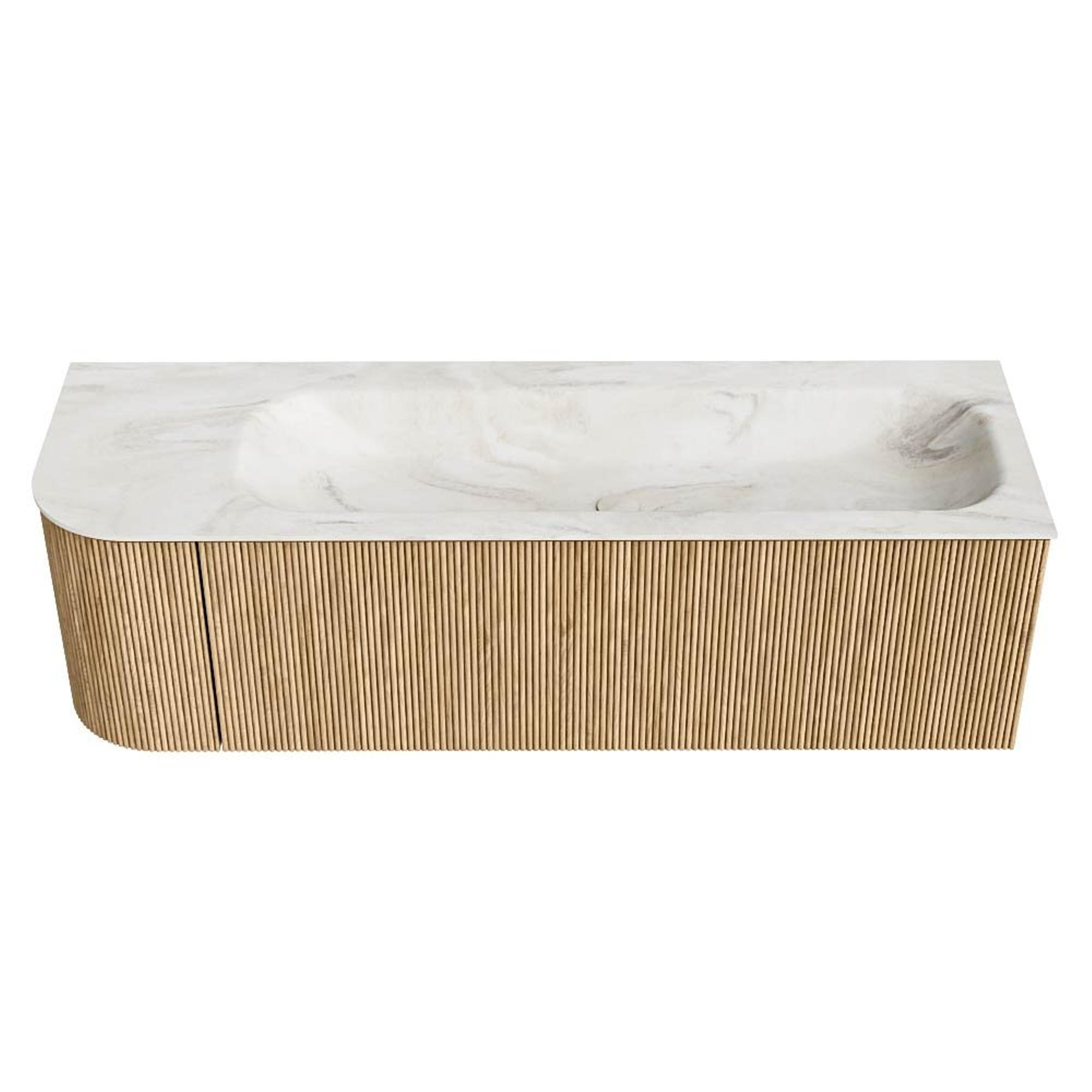 MONDIAZ KURVE-DLUX 145cm badmeubel met module 25 L kleur Oak met 1 lade en 1 deur. Wastafel BIG LARGE rechts zonder kraangat kleur Ostra.
