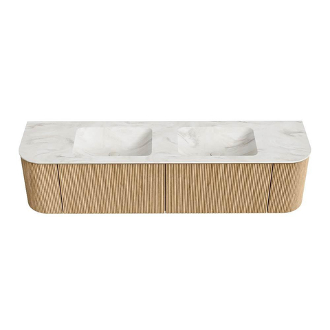 MONDIAZ KURVE-DLUX 180cm badmeubel met module 25 Len R kleur Oak met 2 lades en 2 deuren. Wastafel LEAF dubbel 2 kraangaten kleur Ostra.