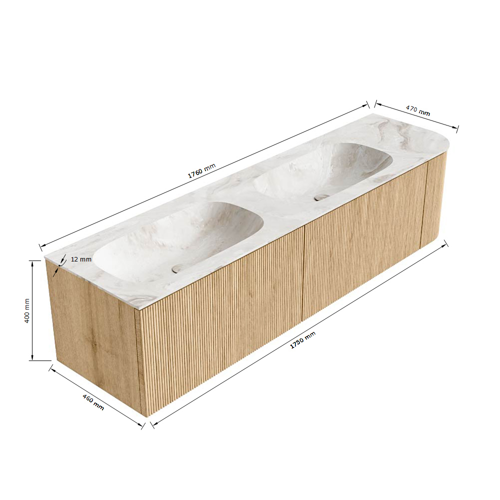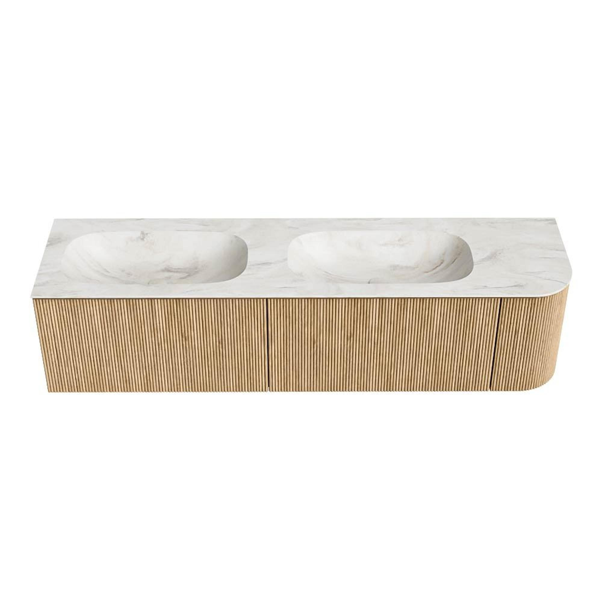 MONDIAZ KURVE-DLUX 175cm badmeubel met module 25 R kleur Oak met 2 lades en 1 deur. Wastafel STOR SMALL dubbel / links 2 kraangaten kleur Ostra.