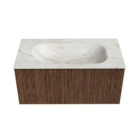 MONDIAZ KURVE-DLUX 90cm badmeubel kleur Walnut met 1 lade. Wastafel BIG SMALL midden zonder kraangat kleur Ostra.