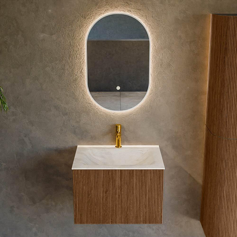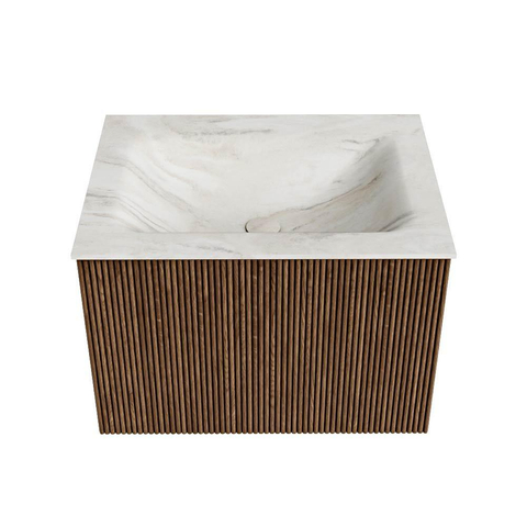 MONDIAZ KURVE-DLUX 60cm badmeubel kleur Walnut met 1 lade. Wastafel CLOUD midden 1 kraangat kleur Ostra.