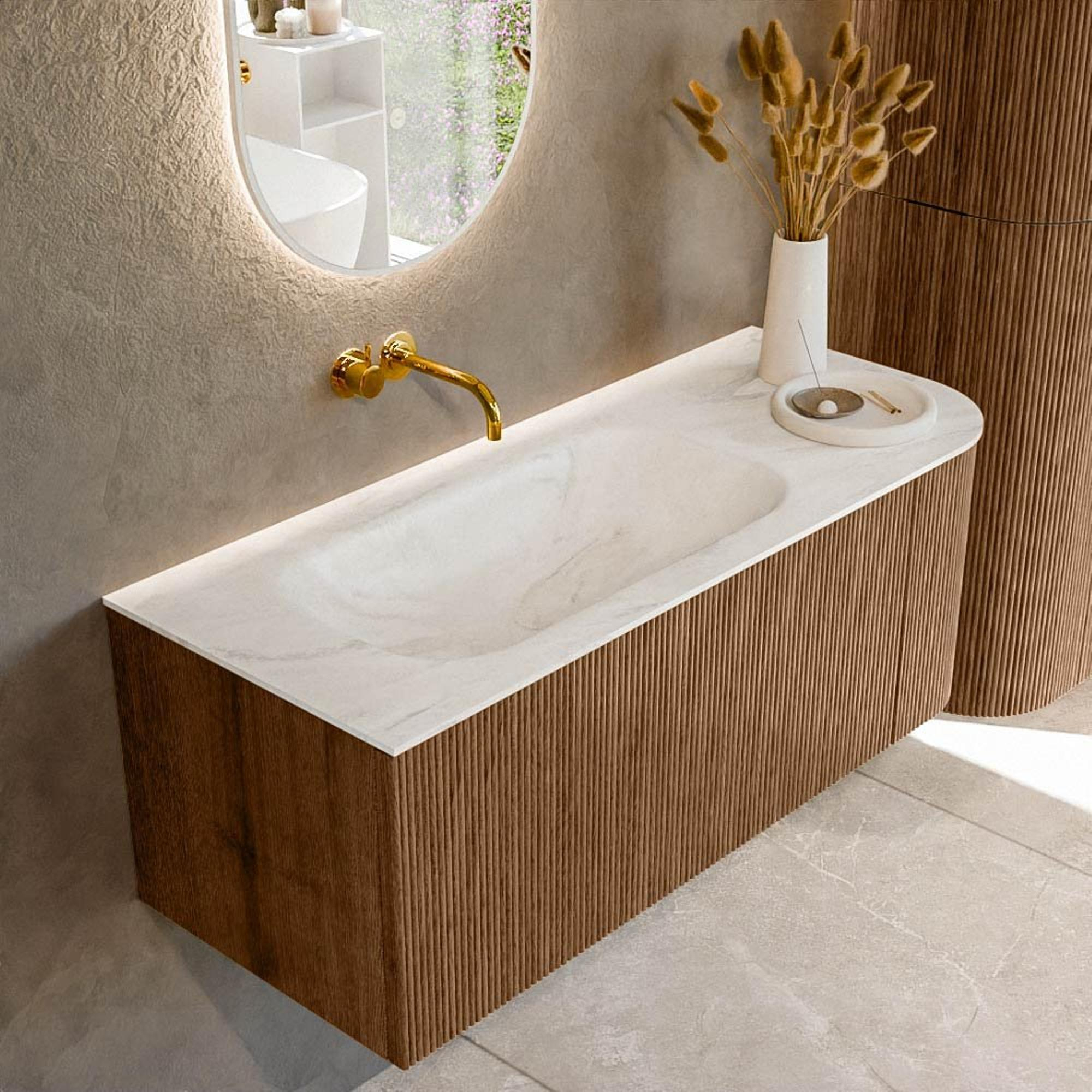 Het ultieme badmeubel dat je badkamer transformeert tot een oase van verfijning. Met zijn halfronde, verticale stroken van massief eiken, verkrijgbaar in de kleuren Oak en Walnut, straalt KURVE vakmanschap uit in elk detail. De zachte rondingen en slim ontworpen deurtjes, elk 40cm hoog, nodigen uit tot gebruik, terwijl de ruimte binnenin optimaal benut wordt dankzij de royale lade van dezelfde hoogte.