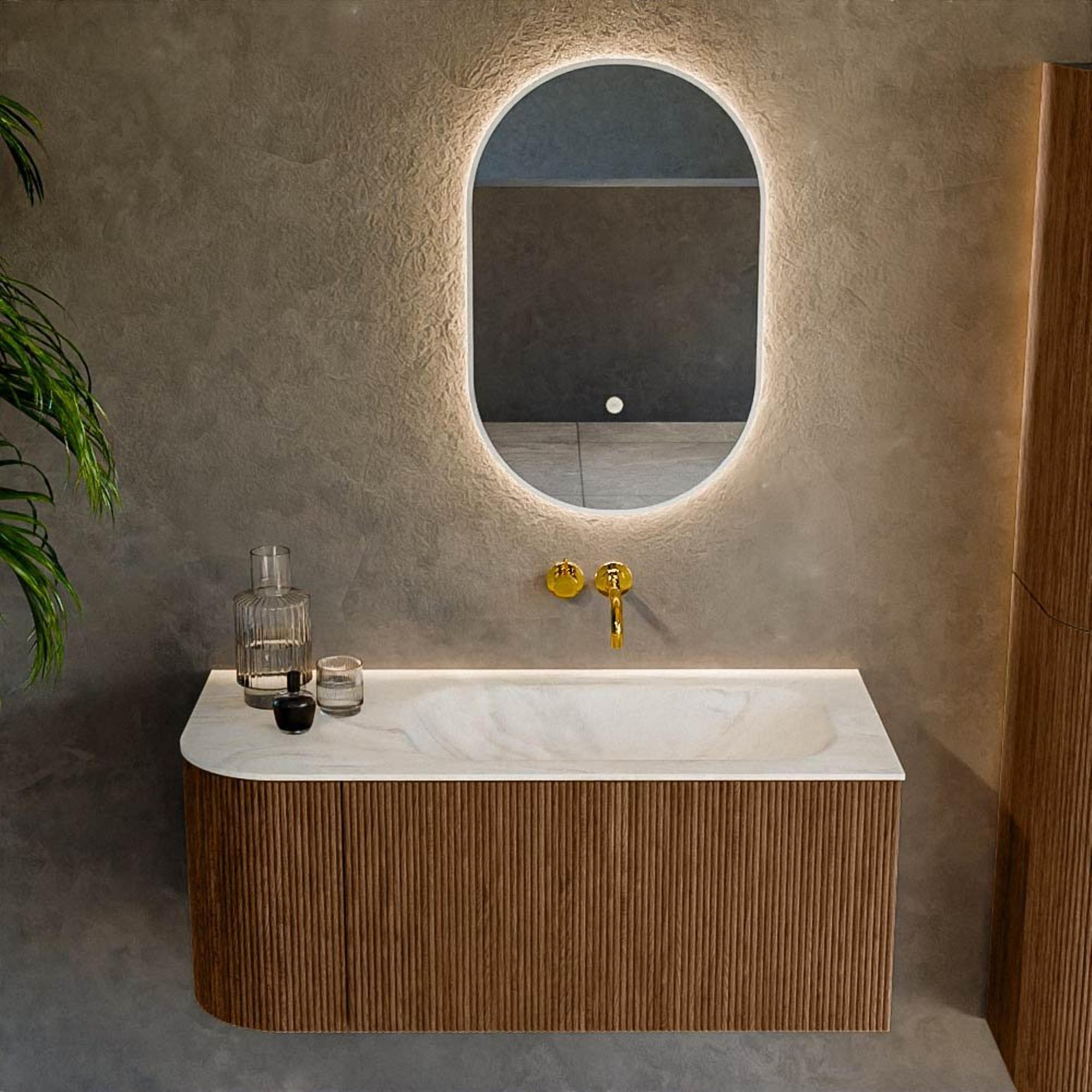 Het ultieme badmeubel dat je badkamer transformeert tot een oase van verfijning. Met zijn halfronde, verticale stroken van massief eiken, verkrijgbaar in de kleuren Oak en Walnut, straalt KURVE vakmanschap uit in elk detail. De zachte rondingen en slim ontworpen deurtjes, elk 40cm hoog, nodigen uit tot gebruik, terwijl de ruimte binnenin optimaal benut wordt dankzij de royale lade van dezelfde hoogte.