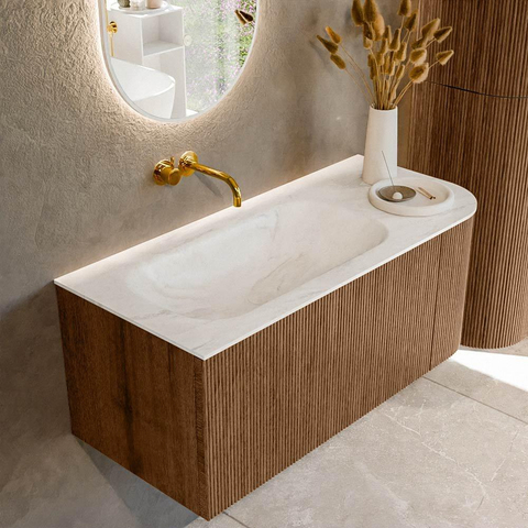 MONDIAZ KURVE-DLUX 105cm badmeubel met module 25 R kleur Walnut met 1 lade en 1 deur. Wastafel BIG SMALL links zonder kraangat kleur Ostra.
