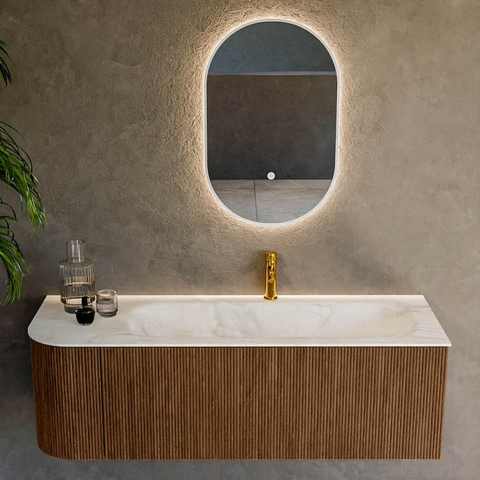 Het ultieme badmeubel dat je badkamer transformeert tot een oase van verfijning. Met zijn halfronde, verticale stroken van massief eiken, verkrijgbaar in de kleuren Oak en Walnut, straalt KURVE vakmanschap uit in elk detail. De zachte rondingen en slim ontworpen deurtjes, elk 40cm hoog, nodigen uit tot gebruik, terwijl de ruimte binnenin optimaal benut wordt dankzij de royale lade van dezelfde hoogte.