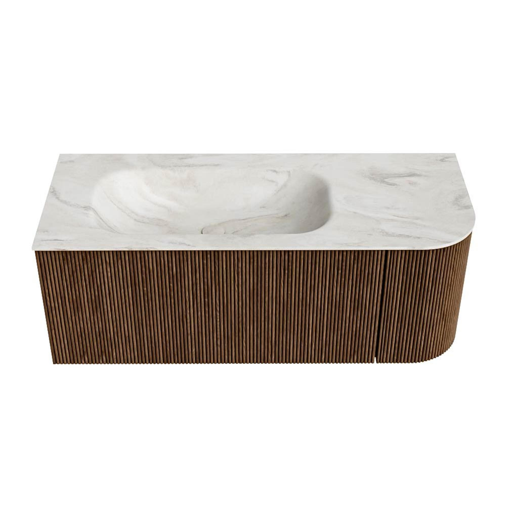 MONDIAZ KURVE-DLUX 115cm badmeubel met module 25 R kleur Walnut met 1 lade en 1 deur. Wastafel BIG SMALL links 1 kraangat kleur Ostra.