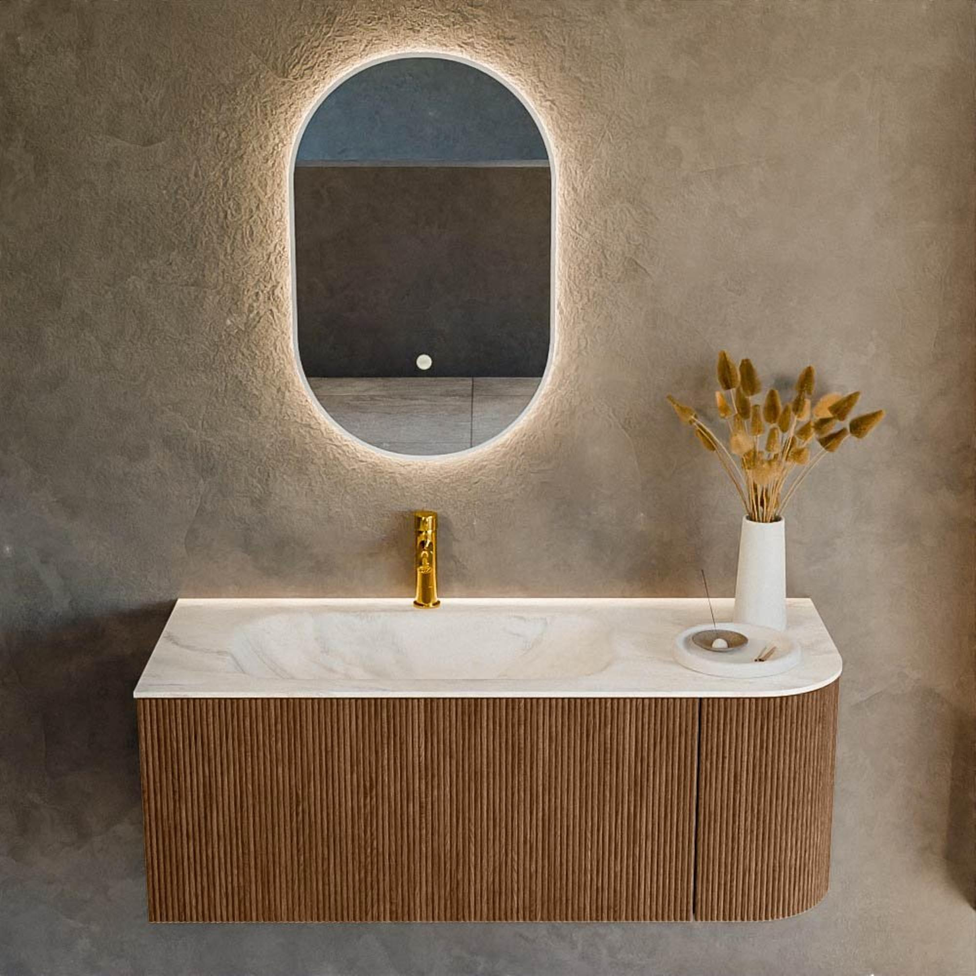 Het ultieme badmeubel dat je badkamer transformeert tot een oase van verfijning. Met zijn halfronde, verticale stroken van massief eiken, verkrijgbaar in de kleuren Oak en Walnut, straalt KURVE vakmanschap uit in elk detail. De zachte rondingen en slim ontworpen deurtjes, elk 40cm hoog, nodigen uit tot gebruik, terwijl de ruimte binnenin optimaal benut wordt dankzij de royale lade van dezelfde hoogte.