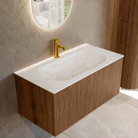 MONDIAZ KURVE-DLUX 90cm badmeubel kleur Walnut met 1 lade. Wastafel BIG SMALL midden 1 kraangat kleur Ostra.