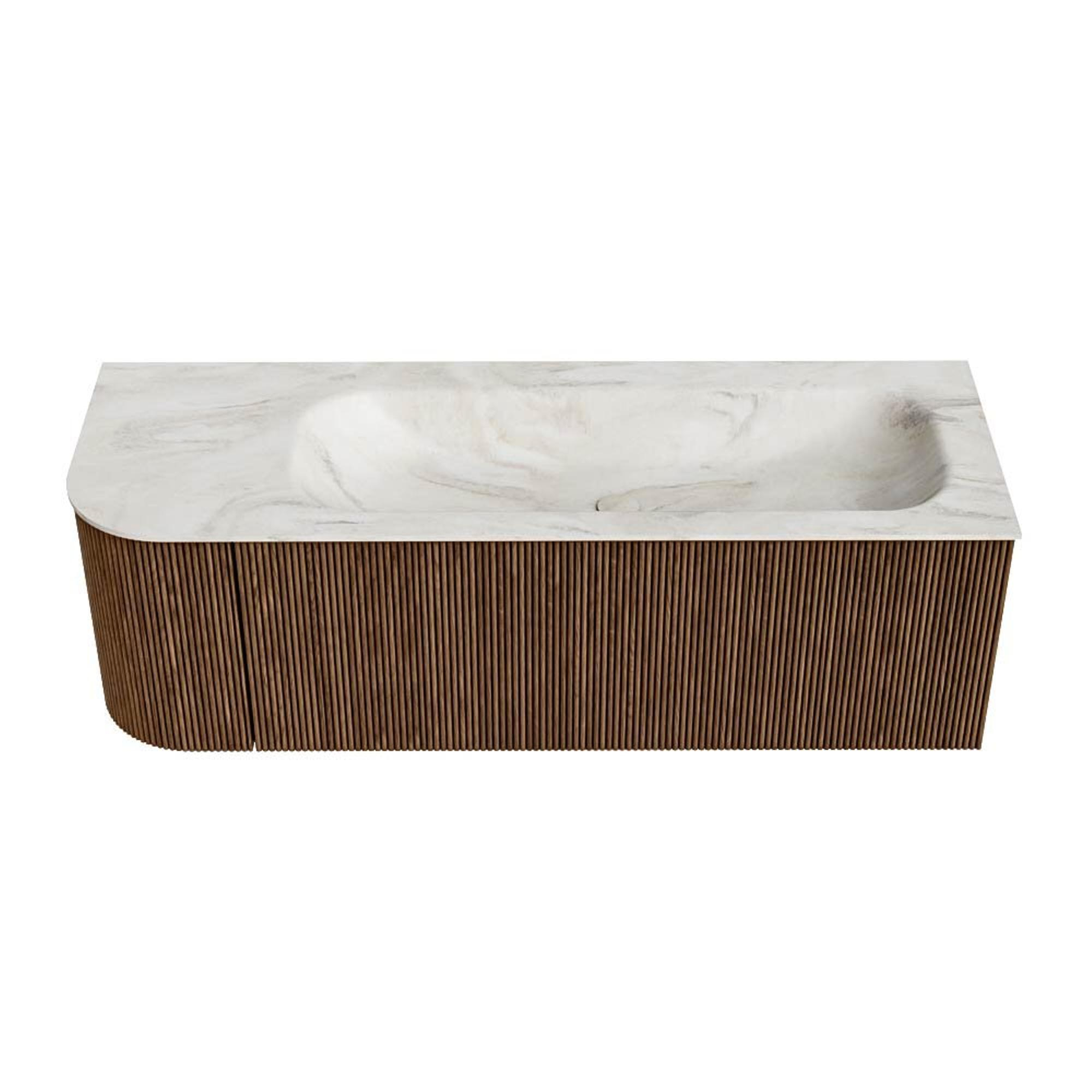 MONDIAZ KURVE-DLUX 135cm badmeubel met module 25 L kleur Walnut met 1 lade en 1 deur. Wastafel BIG MEDIUM rechts zonder kraangat kleur Ostra.