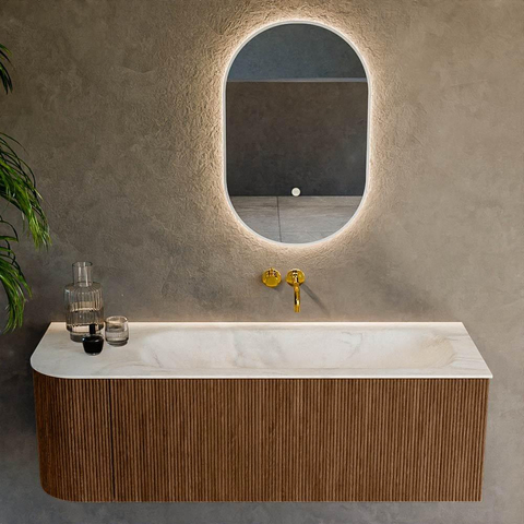 Het ultieme badmeubel dat je badkamer transformeert tot een oase van verfijning. Met zijn halfronde, verticale stroken van massief eiken, verkrijgbaar in de kleuren Oak en Walnut, straalt KURVE vakmanschap uit in elk detail. De zachte rondingen en slim ontworpen deurtjes, elk 40cm hoog, nodigen uit tot gebruik, terwijl de ruimte binnenin optimaal benut wordt dankzij de royale lade van dezelfde hoogte.